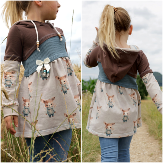 Blossom ist ein süßes Oberteil in zwei Längen und zwei Grundvarianten - einer gerafften Version und einer Version ohne Raffung. Weitere Abwandlungen sind durch einen normalen Ärmel in lang (mit Bündchenabschluss) oder kurz sowie einen gerafften Ärmel mit optionaler Abschlussrüsche möglich. Alle Versionen verbindet die schräge Teilung, die den oberen Bereich des Oberteils mit dem unteren verbindet. Blossom kann mit einem Halsbündchen versehen werden oder mit Kragen bzw. Kapuze genäht werden - so entstehen Varianten für jede Jahreszeit. Wer gerne besonders verspielt näht, kann Blossom mit einer Zwischenrüsche ergänzen. Diese Zwischenrüsche wird zwischen dem oberen und unteren Teil des Oberteils angebracht. Sie verfügt über eine etwas intensivere Raffung als der untere, geraffte Part des Oberteils und bietet auch in der komplett gerafften Version einen weiteren Kontrast.