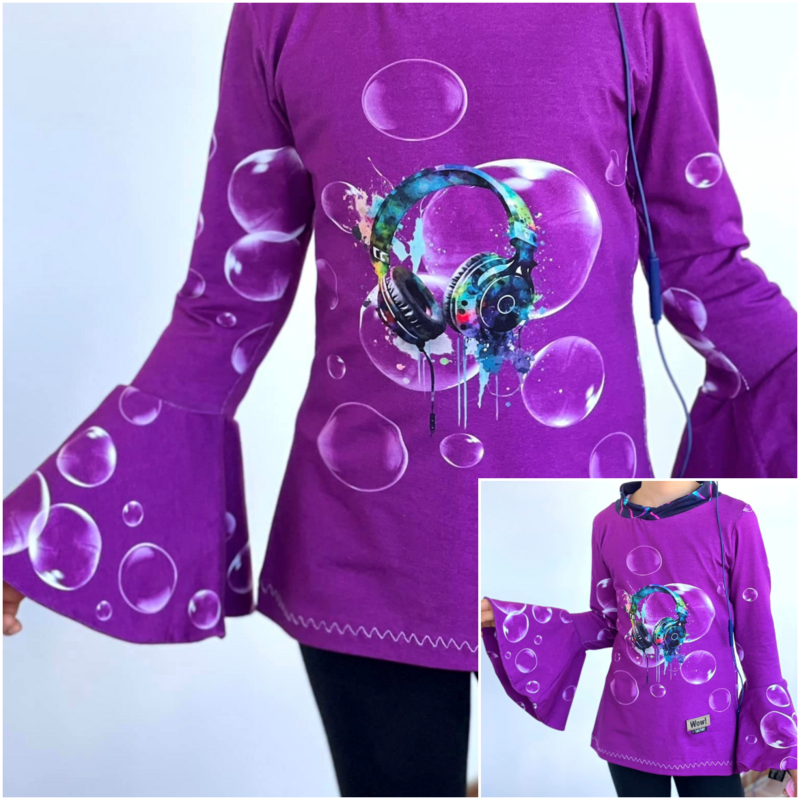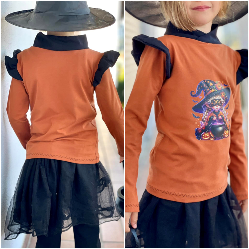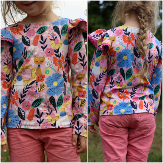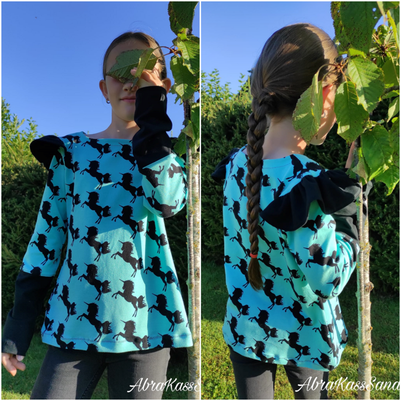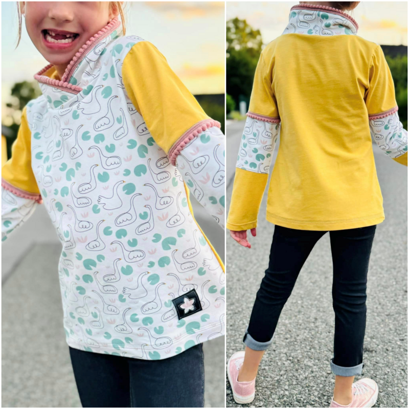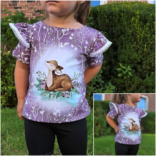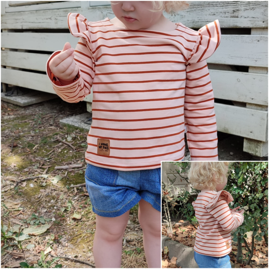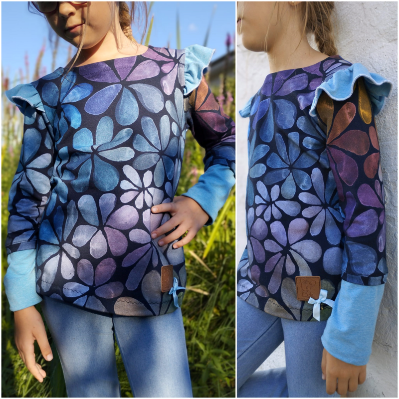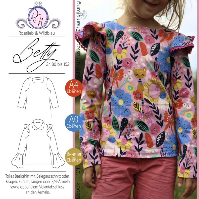 Das Schnittmuster Betty ist ein einfaches und trotzdem besonderes Basicshirt. Es ist als treuer Alltagsbegleiter gedacht und kann mit kleinen Extras richtig toll aufgehübscht werden. Mit der etwas kürzeren, einfachen Shirt- länge passt es prima zu Jeans und Co. und kann z.B. mit einem Gürtelchen ein Outfit bilden. Besonders an diesem Schnitt ist der Belegausschnitt mit seiner leichten Uboot-Form, welcher optional auch mit einem kurzen Stehkragen genäht werden kann. Als Ärmeloptionen gibt es einen kurzen bzw. langen Ärmel, welcher mit einem Saum abgeschlossen wird. Alternativ kannst du den Ärmel als 3/4-Ärmel nutzen oder den schönen, weiten Ärmelvolant annähen. Als süße Kombinationsmöglichkeit enthält der Schnitt auch noch Flügelärmel. Betty verzichtet komplett auf Teilungen und wirkt sowohl aus Unistoffen, aus Panels und auch aus Musterstoffen gut :)!