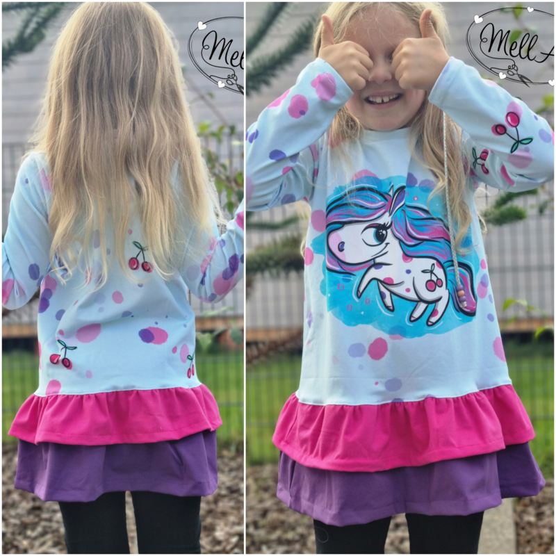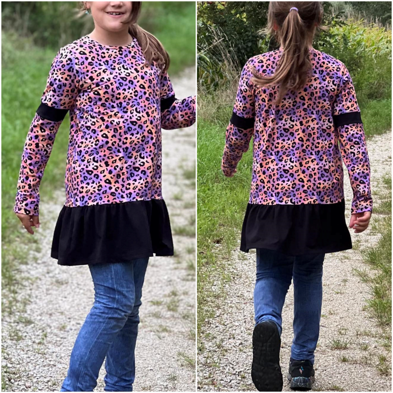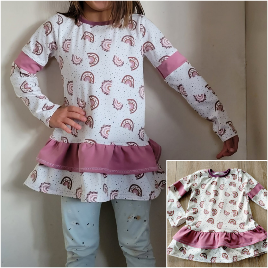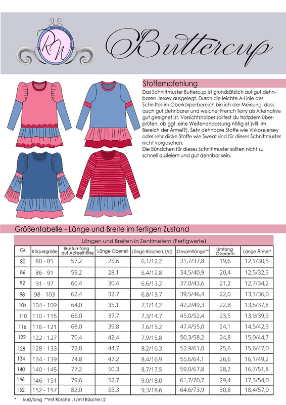 Das Schnittmuster ist in Echtgröße (du nähst hier nach echter Körpergröße) gradiert und enthält keine Naht- und Saumzugabe. Es umfasst die Größen 80 bis 152 und ist damit für eine Körpergröße zwischen 80 und 157cm geeignet. In den Dateien findest du die A4-Versionen zum Ausdrucken, eine A0-Datei sowie die Beamerdatei - alle Versionen inkl. Ebenen zum Ein- und Ausblenden der Größen. Buttercup ist auf Jersey und French Terry ausgelegt.