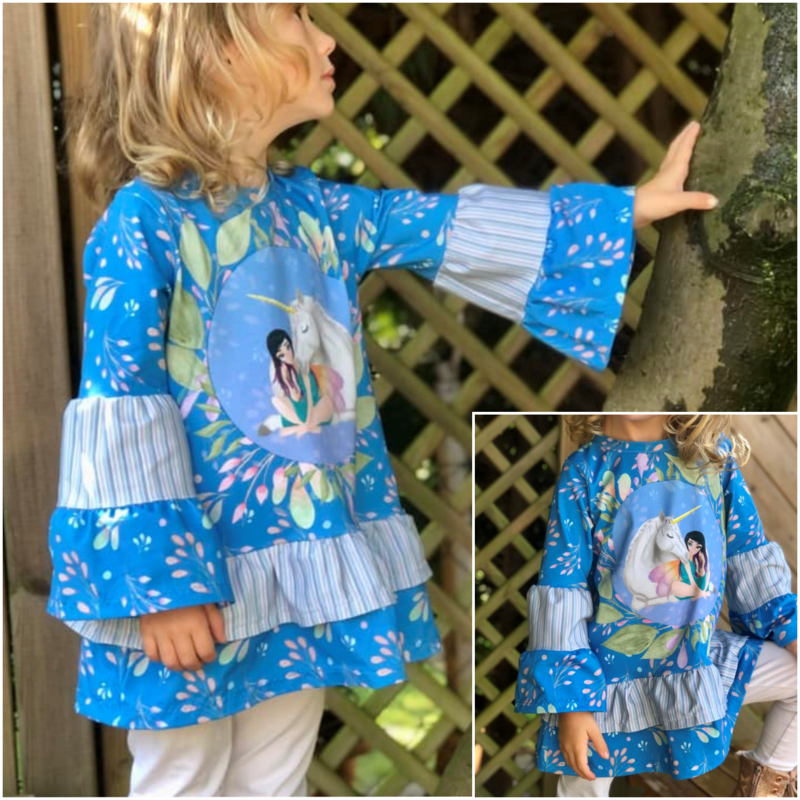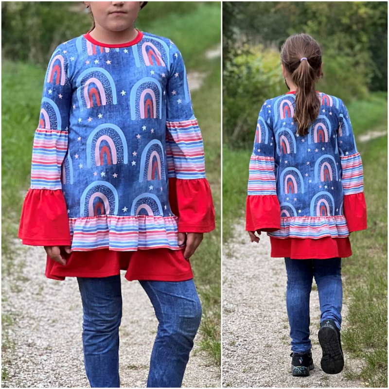 Buttercup ist ein locker und weit geschnittenes Oberteil in Tunikalänge. Besonders machen den Schnitt die Rüschen, welche in zwei Längen oder doppellagig angebracht werden können sowie die vielen, untereinander kombinierbaren Ärmelvarianten. Buttercup verfügt über eine Abschlussrüsche in zwei Längen. Die Linie für beide Längen kann auch als Teilungslinie genutzt werden. Als einfache Nähvariante kannst du eine der beiden Abschlussrüschenlängen nutzen oder als etwas aufwendigere, ausgefallenere Variante beide Rüschenlängen gemeinsam anbringen. Buttercups normaler Ärmel verfügt über eine kleine Teilung, eine geraffte Ärmelergänzung, welche zu einem Puffärmel führt und über geraffte Abschlussrüschen mit denen du immer wieder neue Looks zaubern kannst. Das Schnittmuster wird mit Saumabschlüssen angefertigt und verfügt über einen bequemen Rundhalsausschnitt mit Bündchen.