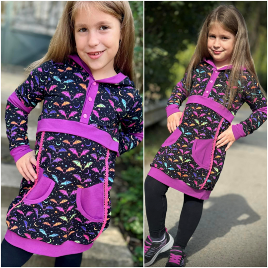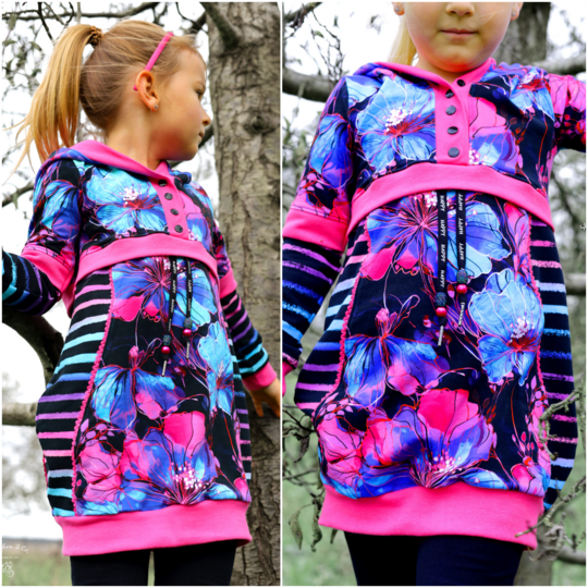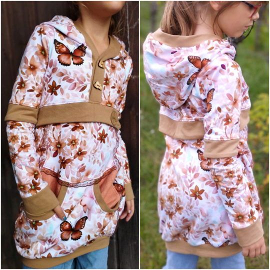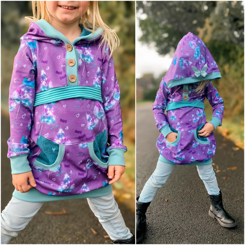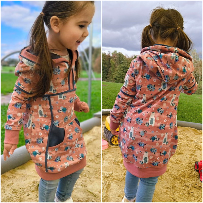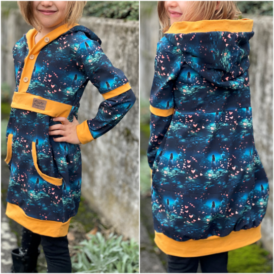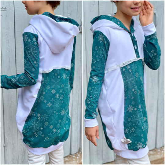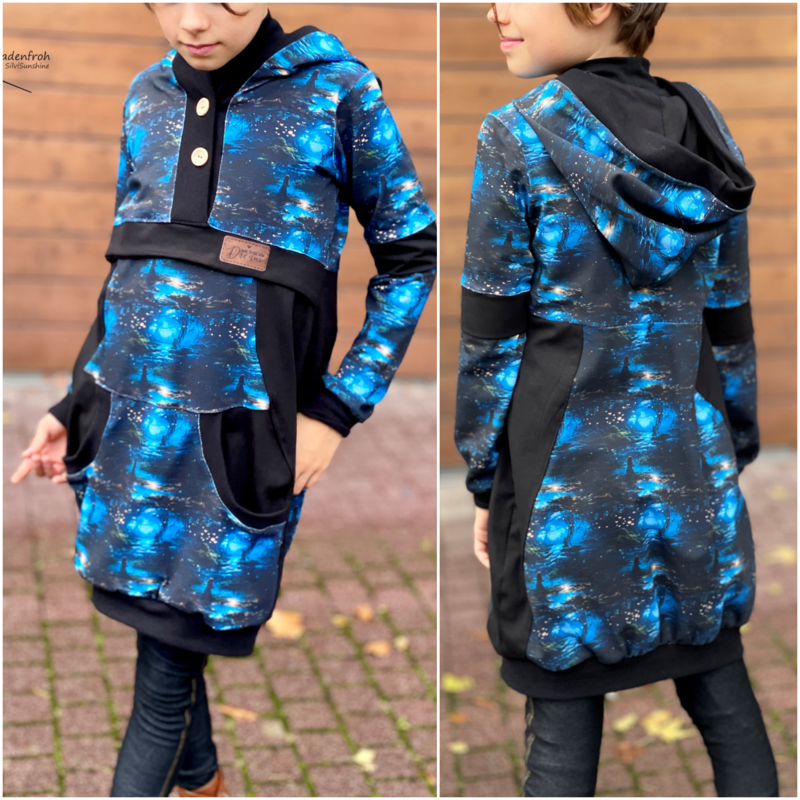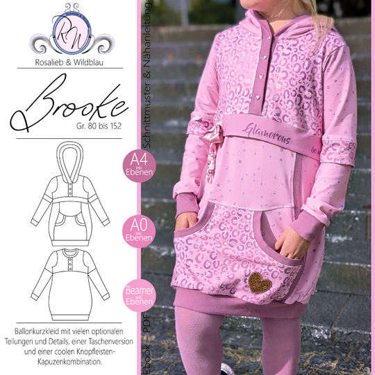 Brooke ist das Schnittmuster zu einem tollen Ballonkleid mit vielen Teilungen und tollen Details. Das Schnittmuster verfügt über eine grundsätzliche Brustteilung, welche sich mit Zierbündchen ergänzen lässt. Diese Teilung kann auch auf die Ärmel übertragen werden. Im unteren Bereich gibt es bei Brooke zwei längliche Teilungen und eine Mittel- teilung, die auf aufregende Weise auch als Tasche genäht werden kann. Ein Rundhalsausschnitt mit Bündchen kann durch eine Zierknopfleistenteilung ergänzt werden, während die enthaltene Kapuze mit Knopfleiste genäht wird. Die Knopfleiste teilt den oberen Teil des Vorderteils und besteht aus einem Bündchen, das über die gesamte Gesichtsöffnung der Kapuze verläuft. So entstehen sauber genähte und gleichzeitig maximal gestalt- bare Varianten, die immer wieder neu kombiniert und umgesetzt werden können. Der allgemeine Abschluss sowie die Ärmelabschlüsse werden bei Brooke mit einem Bündchen versehen.