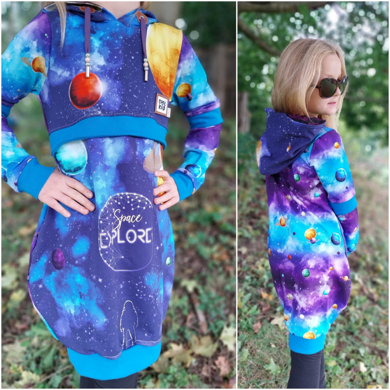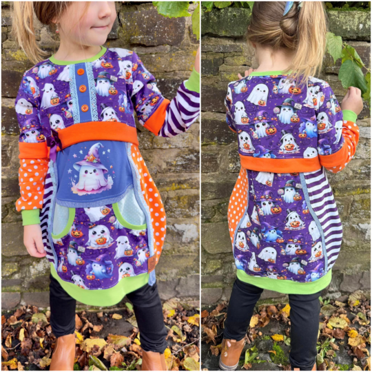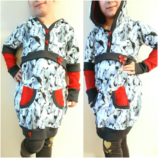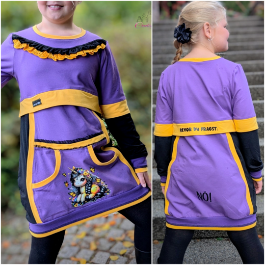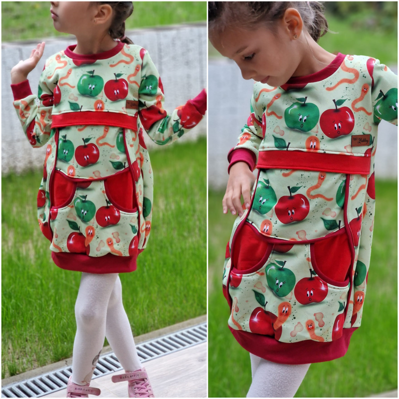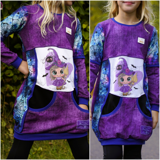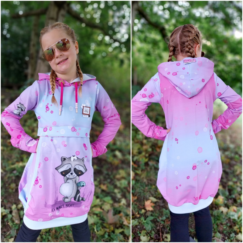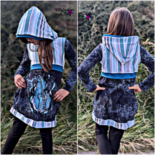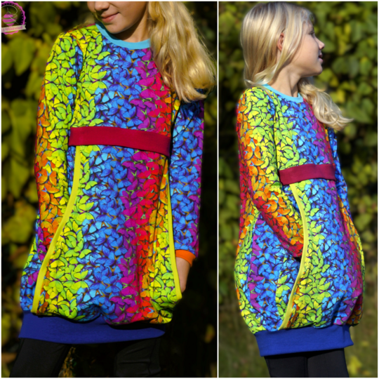 Brooke ist das Schnittmuster zu einem tollen Ballonkleid mit vielen Teilungen und tollen Details. Das Schnittmuster verfügt über eine grundsätzliche Brustteilung, welche sich mit Zierbündchen ergänzen lässt. Diese Teilung kann auch auf die Ärmel übertragen werden. Im unteren Bereich gibt es bei Brooke zwei längliche Teilungen und eine Mittel- teilung, die auf aufregende Weise auch als Tasche genäht werden kann. Ein Rundhalsausschnitt mit Bündchen kann durch eine Zierknopfleistenteilung ergänzt werden, während die enthaltene Kapuze mit Knopfleiste genäht wird. Die Knopfleiste teilt den oberen Teil des Vorderteils und besteht aus einem Bündchen, das über die gesamte Gesichtsöffnung der Kapuze verläuft. So entstehen sauber genähte und gleichzeitig maximal gestalt- bare Varianten, die immer wieder neu kombiniert und umgesetzt werden können. Der allgemeine Abschluss sowie die Ärmelabschlüsse werden bei Brooke mit einem Bündchen versehen.