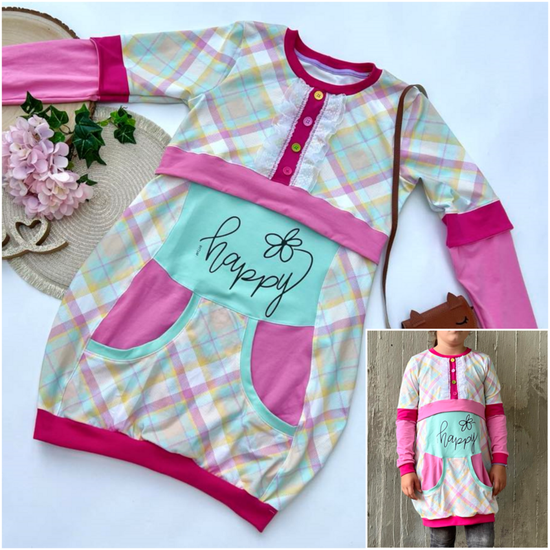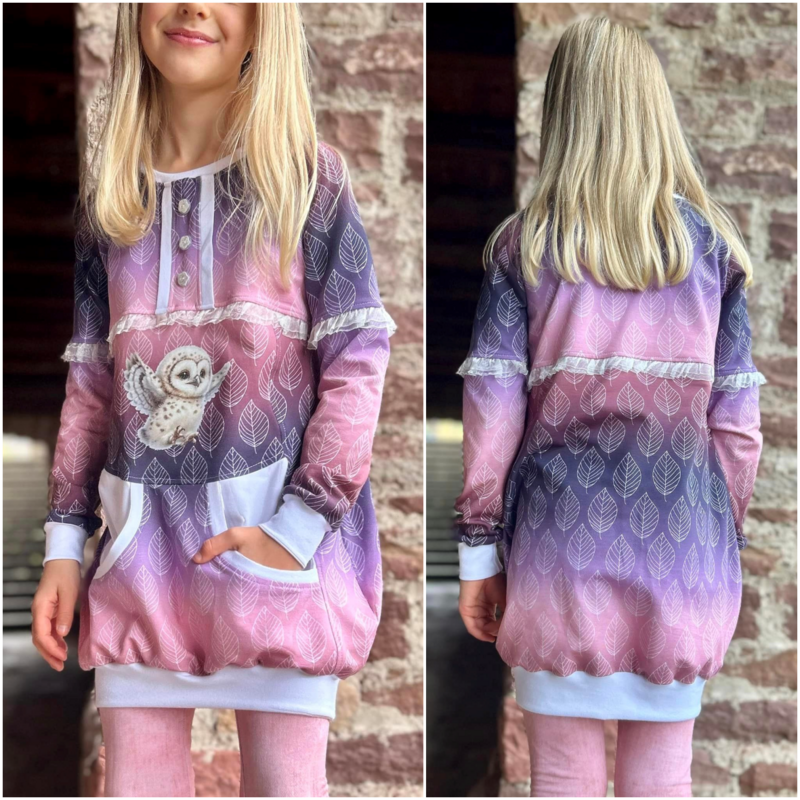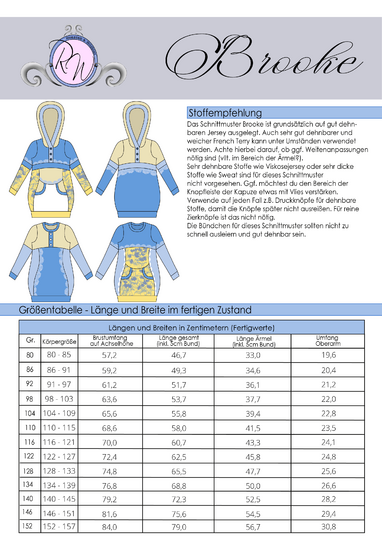 Das Schnittmuster ist in Echtgröße (du nähst hier nach echter Körpergröße) gradiert und enthält keine Naht- und Saumzugabe. Es umfasst die Größen 80 bis 152 und ist damit für eine Körpergröße zwischen 80 und 157cm geeignet. In den Dateien findest du die A4-Versionen zum Ausdrucken, eine A0-Datei sowie die Beamerdatei - alle Versionen inkl. Ebenen zum Ein- und Ausblenden der Größen. Brooke ist auf Jersey und weichen, gut dehnbaren French Terry ausgelegt (ggf. mit Anpassungen).