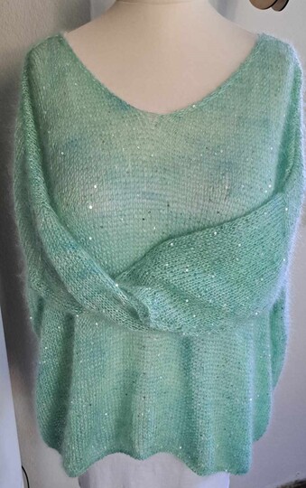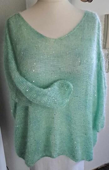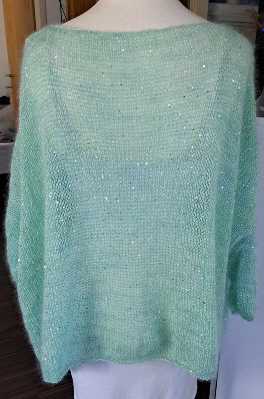 Ich stelle euch hier einen ungewöhnlichen Oversize Pulli in gestrickter Form vor. Durch die Pailetten und das Seidengemisch wirkt er sehr elegant.