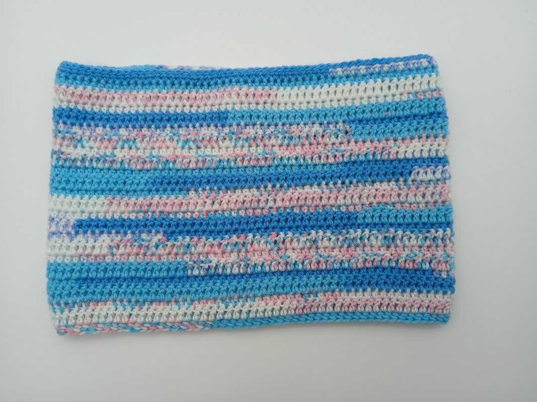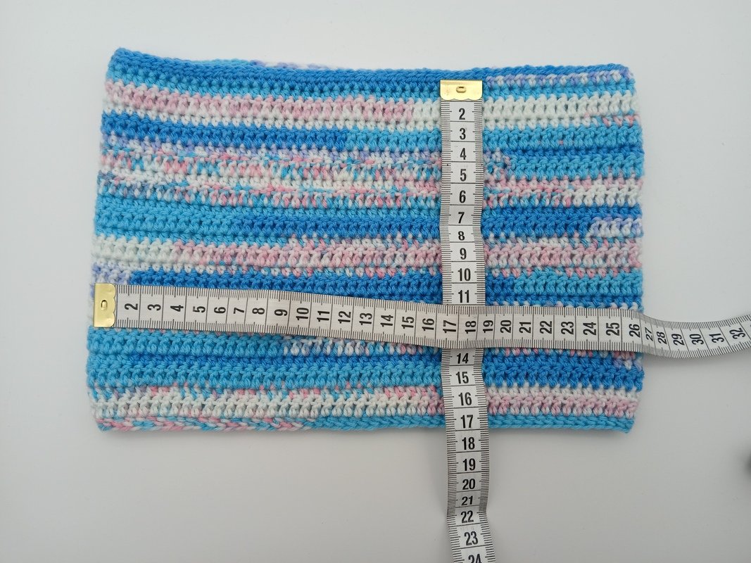 Der Schal ist ca. 17 cm hoch und doppelt gelegt ca. 26 cm breit. Du solltest ihn locker über den Kopf ziehen können. Die Größe ist einfach anpassbar. Bei Fragen kannst du mich gerne anschreiben