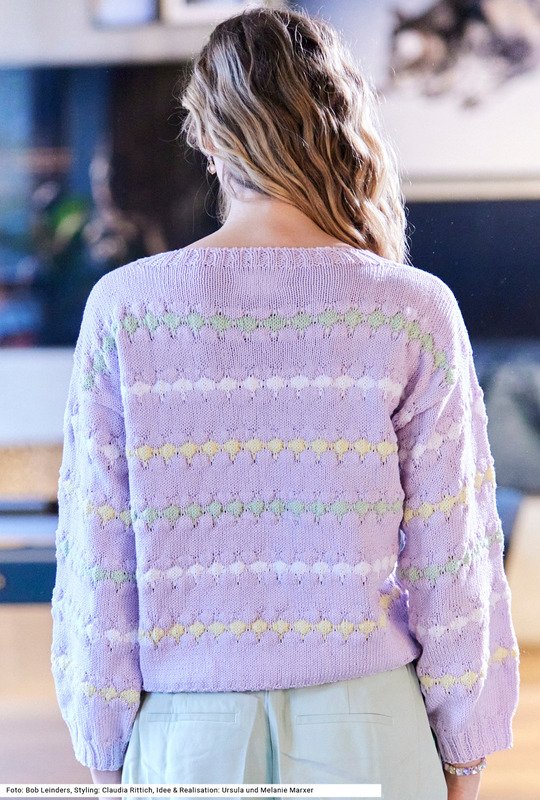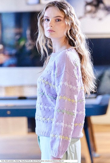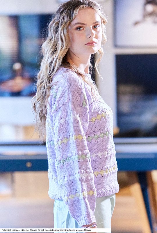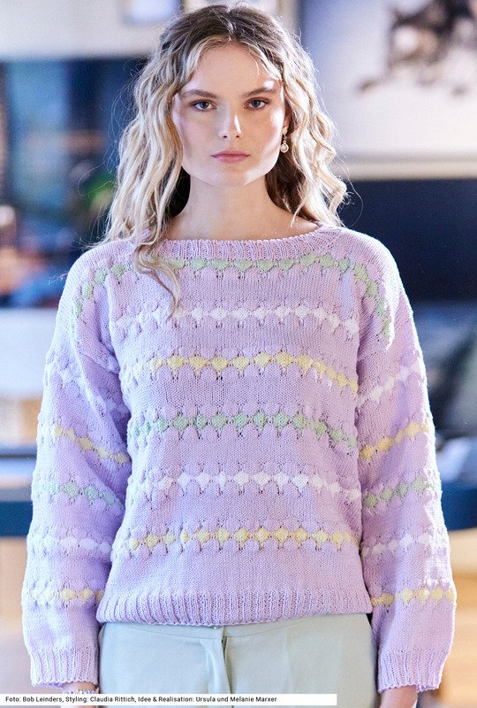 Eine Grundfarbe, die glatt rechts verstrickt ist und ein interessantes Wabenmuster in dreierlei Farben ergeben einen Pullover der auffällt. Da braucht es keinen aufwändigen Schnitt. Es genügt, alle Teile ganz gerade zu arbeiten. Bei den Ärmeln wird die großzügige Weite mit einem halb so weiten Rippenbund zusammengehalten. Noch eine Besonderheit weist die Rippenblende um den Halsausschnitt auf: Sie wird am Ende italienisch abgenäht. Eine Anleitung für ein Garn aus reiner Baumwolle kann für die Größen 36/38, 40/42 und 44/46 downgeloadet werden.