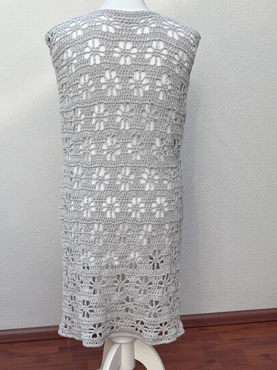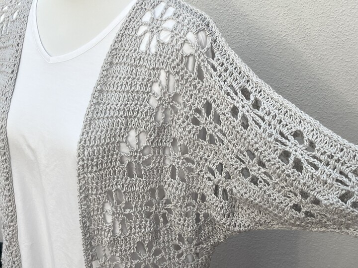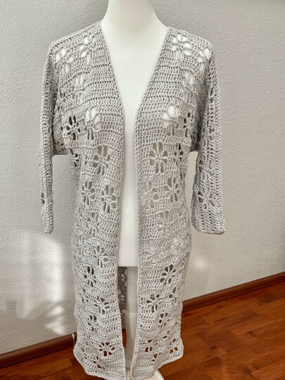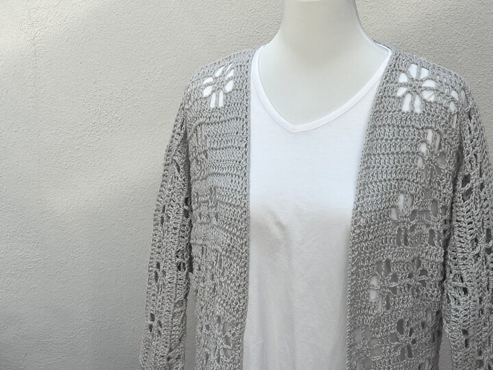 Leichtes Häkeljäckchen in schönem Blümchenmuster, das sich leicht und schnell nacharbeiten lässt. Rücken- und Vorderteile werden in einem Stück begonnen und die Ärmel mit eingehäkelt. Die Anleitung ist für ca. Größe 34/36 und lässt sich leicht für andere Größen anpassen.