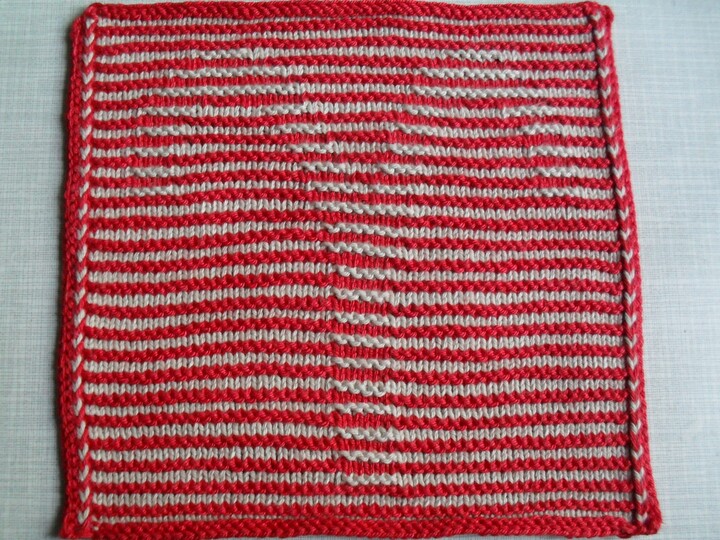 Benötigt wird Baumwollgarn in zwei Farben, gesamt ca. 40 Gramm. Ich habe meine Anleitungen mit Catania, Cotone von Lanagrossa, Twister Ibiza, Baumwolle von Sostrene greene und von Mayflower gestrickt, je nachdem, wo mir die Farben am besten gefallen haben. Die Nadelstärke ist 2 1/2 oder 3, je nach Material und Strickweise, es muß sehr fest gestrickt werden!