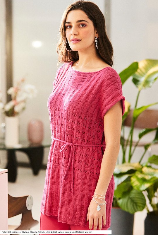 Eine Tunika mit besonderen längs und quer verlaufenden Rippen. Sie werden glatt rechts und kraus rechts gestrickt. Das Hebemaschen-Lochmuster betont die Mitte des Modells. Dazu eine kraftvolle Farbe und ein figurschmeichelnder Schnitt. Ein schmales Bindeband – als I-Cord gearbeitet – macht eine zusätzliche Taillierung der Tunika möglich. Das Garn besteht aus Baumwolle und Hanf – genau das richtige für heiße Sommertage. Eine Anleitung gibt es für die Größen 38 – 42 und 44 – 48 sowie 50 – 54.