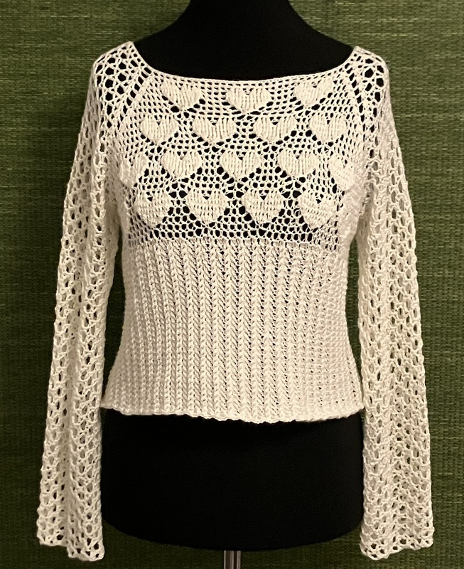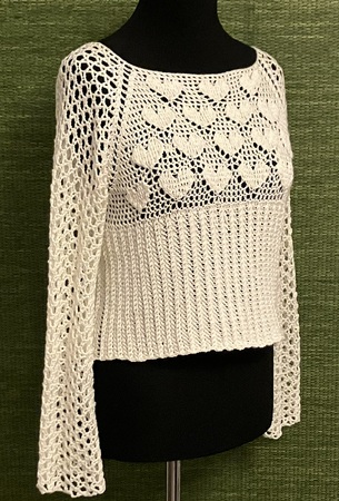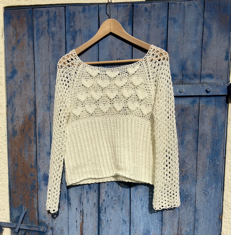 Dieses Shirt ist als RVO (Raclan von oben) gehäkelt. Das heißt, man beginnt am Halsausschnitt und häkelt dann das ganze Shirt in einem Stück (ganz ohne Naht) nach unten. Die Ärmel sind in einem luftigen Sterne-Muster gehalten, während der Body im oberen Teile süße Herzen zeigt und im unteren Teil in einem speziellen Rippenmuster gehäkelt ist.