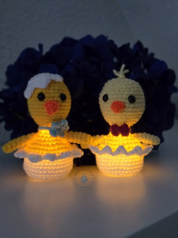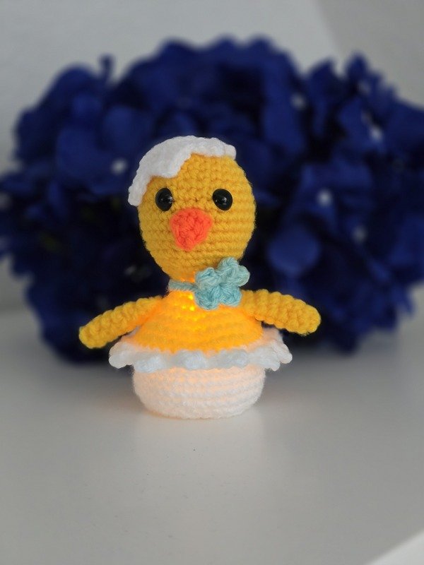 PDF-Anleitung für ein beleuchtetes Osterküken. Auch zu Ostern wird es abends schon schnell dunkel und wie schön ist es dann, wenn das kleine Osterküken erstrahlt. Mit der Anleitung können beide Varianten gehäkelt werden.
