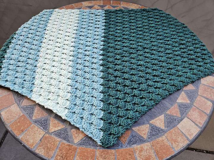 Bei Farbverlaufsgarn empfehle ich je nach Wunschgröße und Häkelweise eine Lauflänge mit 1000 m bis 1200 m 4-fädig und eine dazu passende Nadelstärke.