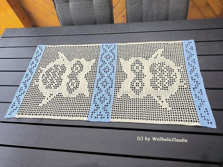 Dieser Läufer ist für alle Eulenfans ein Hingucker. Er wird in Filethäkeltecknik gearbeitet und man kann ihn mit jeder beliebigen Nadel- und Garnstärke anfertigen, lediglich die Größe ändert sich dann natürlich.