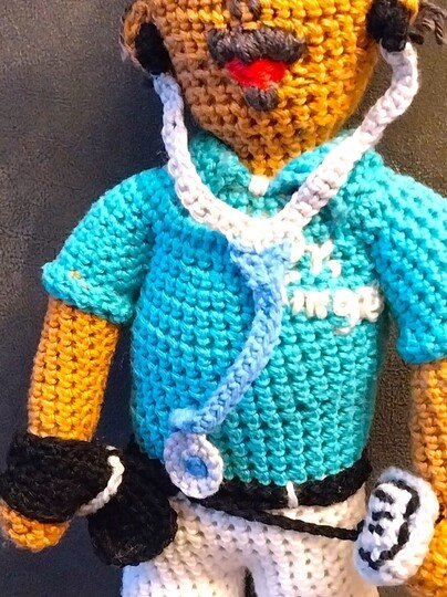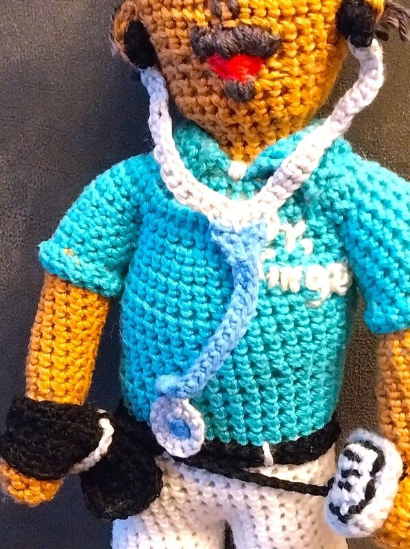 Die Arzt Puppe wurde mit 100 % Baumwollgarn, mit Häkelnadel Nr. 2,5 gehäkelt, und ist dann ca. 32 cm hoch