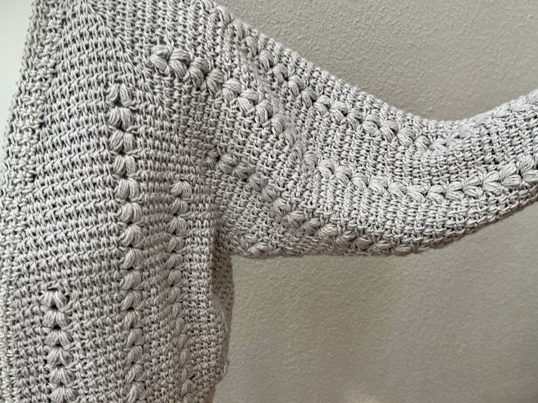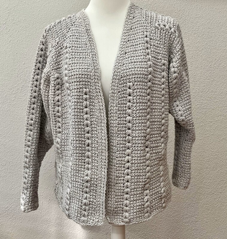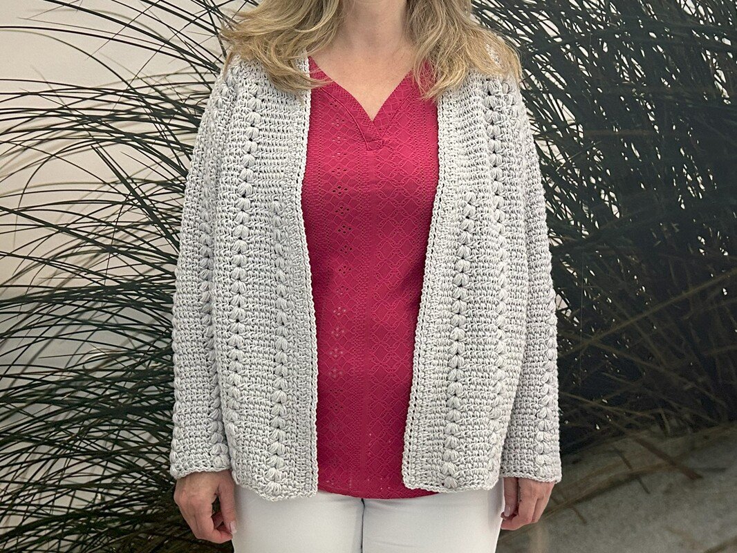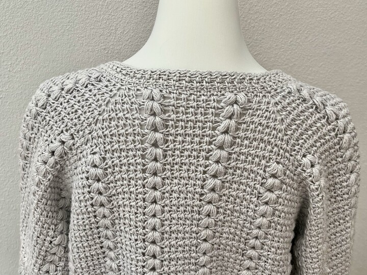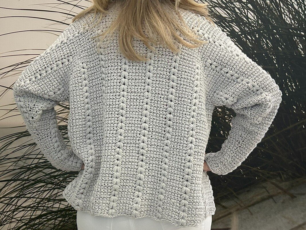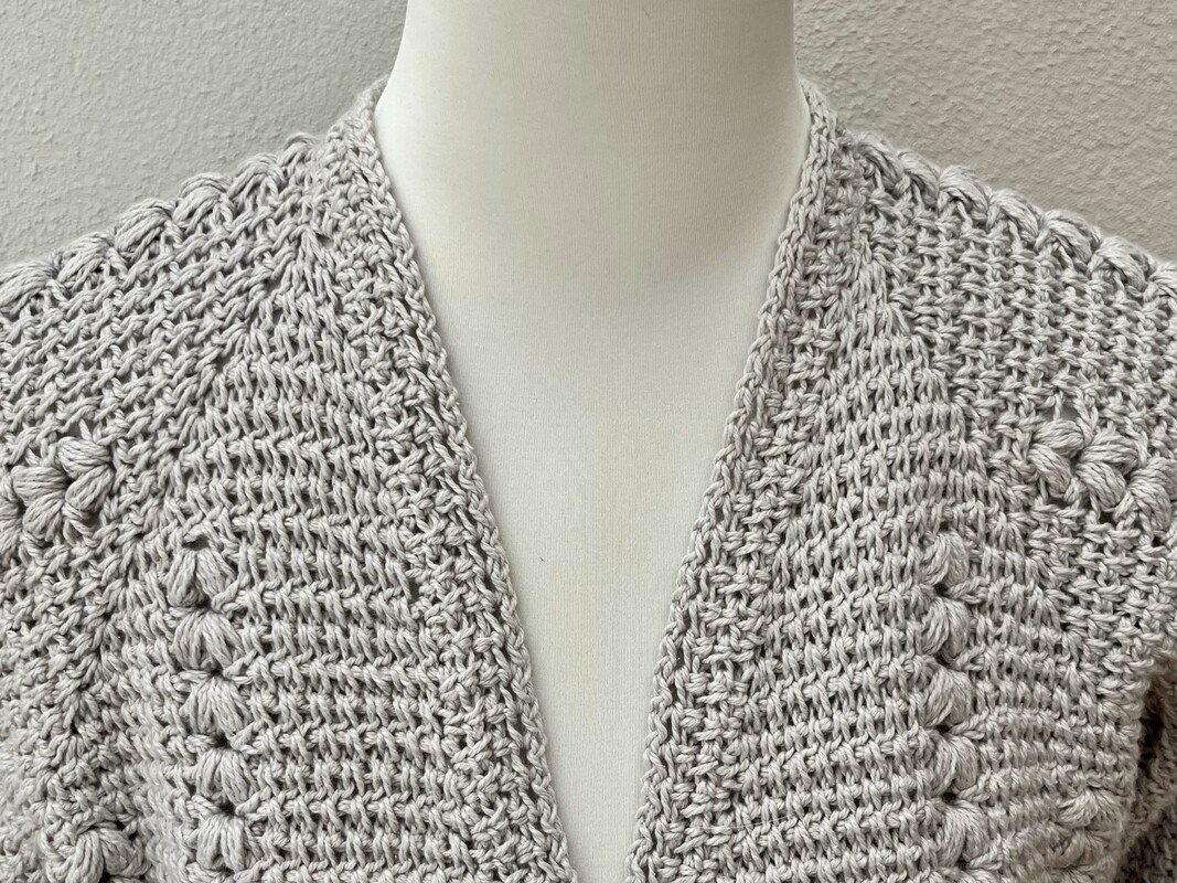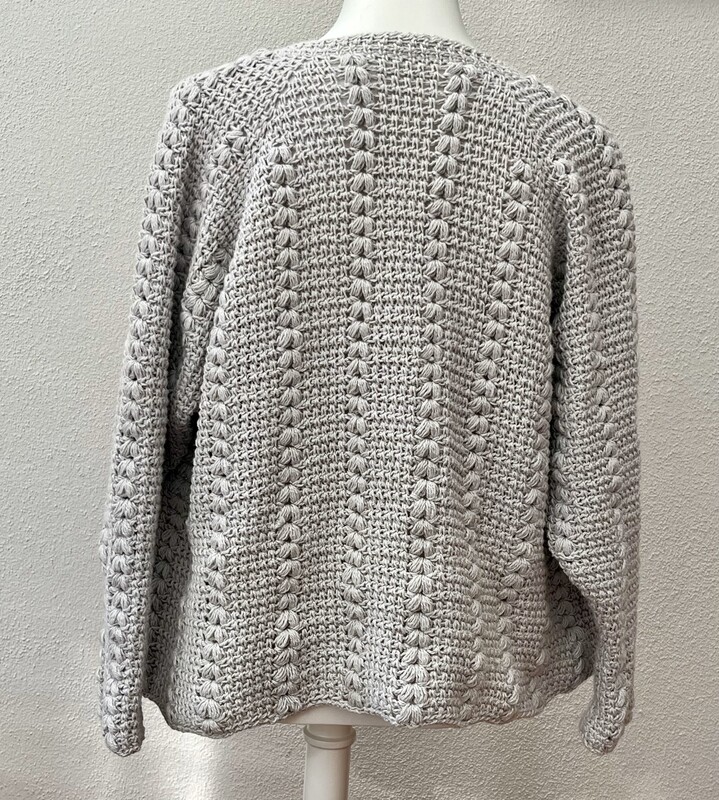 Kurzes Häkeljäckchen mit Büschelmaschen, die wie kleine Zöpfe aussehen. Das Muster ist leicht nachzuarbeiten. Die Jacke hat Raglanärmel und wird vom Halsausschnit (also von oben) gearbeitet. Die Anleitung ist für ca. Größe 34/36 und lässt sich leicht für andere Größen anpassen. Bitte lies die gesamte Anleitung einmal durch, bevor du mit der Häkelarbeit beginnst.