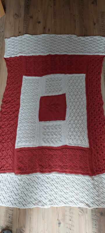 Die Decke besteht komplett aus Ajourmustern, wird in Streifen gearbeitet, die am Ende zusammengenäht oder -gestrickt werden. Beim Zusammennähen funktioniert am besten der Matratzenstich, der in der Anleitung per Videolink erklärt wird.