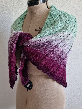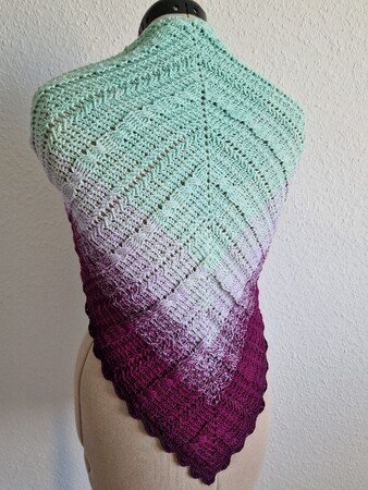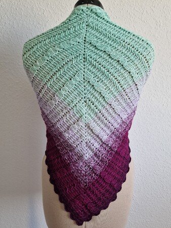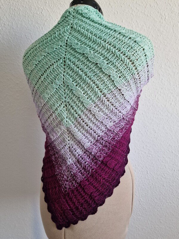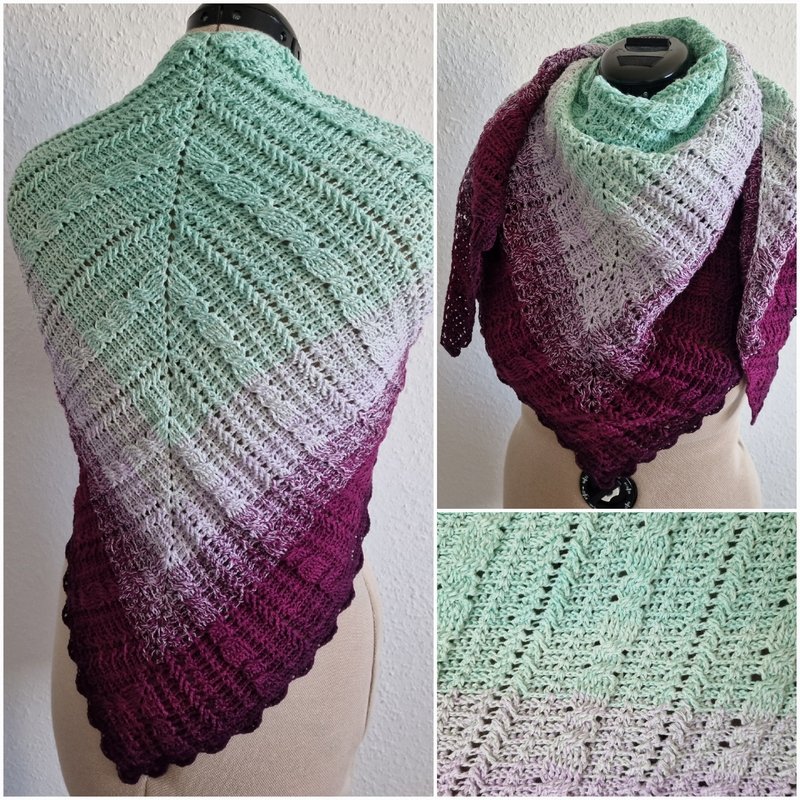 Du kannst dir nach dieser Anleitung ein wunderschönes Dreieckstuch in einem Mustermix häkeln, der aus Streifen mit Zöpfen, überkreuzten Reliefstäbchen, die dann wie ein großes V aussehen, sowie hinteren Reliefstäbchen und V – Stäbchen besteht.
