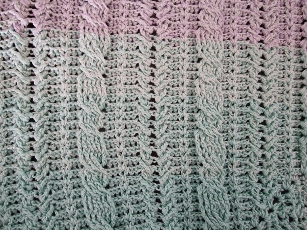 Du solltest neben Luftmaschen, festen Maschen, Stäbchen, vorderen und hinteren Reliefstäbchen auch doppelte Reliefstäbchen können. Die Zöpfe und Überkreuzungen für das V - Muster werden in Tutorials beschrieben.