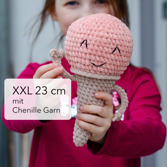 Mit ihrer freundlichen Eis-Kugel, süßen Ärmchen und dem verspielten Lächeln bringt sie Freude in jedes Zuhause – und das in nur ca. einer Stunde Häkelzeit!