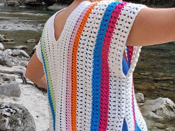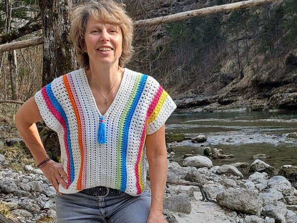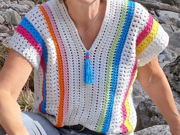 Sommer, Sonne, Häkelspaß! MIt dieser Anleitung zauberst du dir ein luftig-leichtes Sommershirt, ein perfektes Shirt für warme Tage. Die bunten Akzente sorgen für einen frischen, fröhlichen Look. Ob am Strand, in der Stadt oder im Café - dieses Shirt ist ein echter Hingucker. Die Quaste gibt dem Shirt eine ganz individuelle Note. Das Shirt wird in einem Stück gehäkelt und das quer gehäkelte Design sorgt für eine tolle Passform.