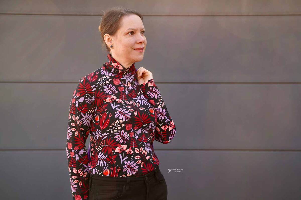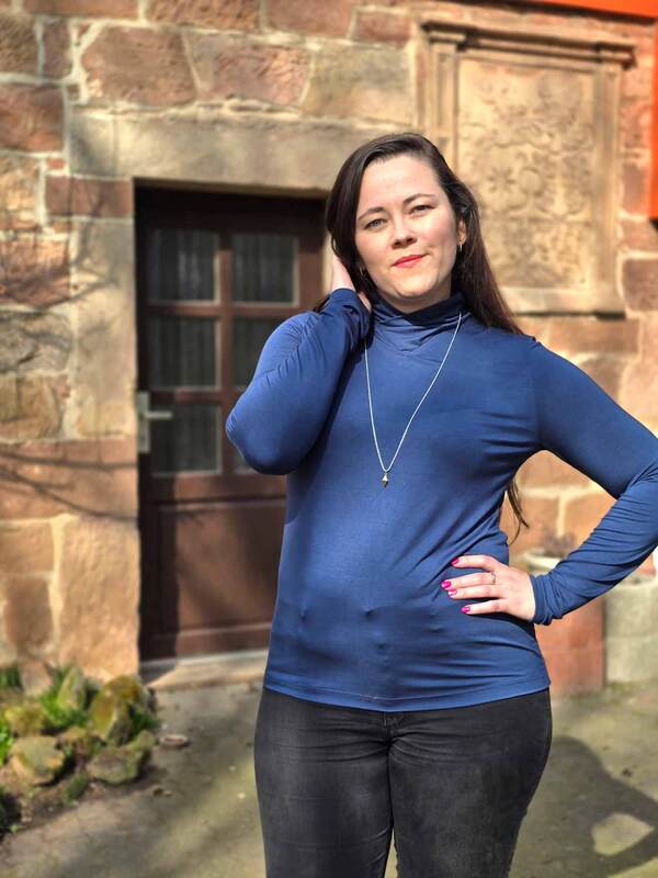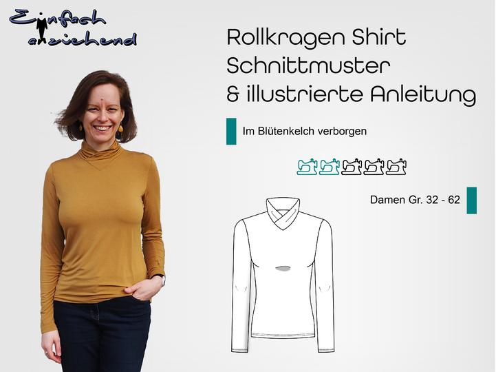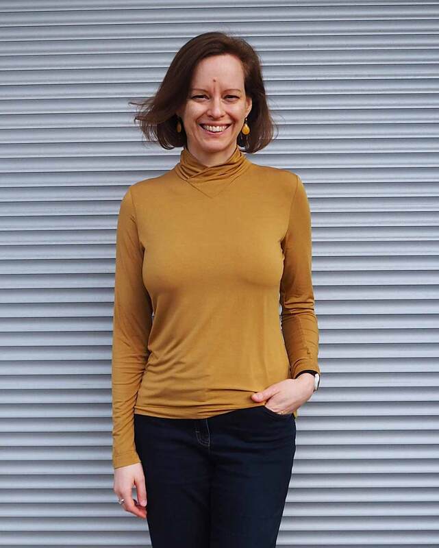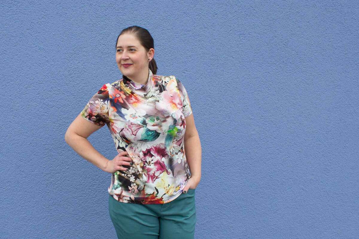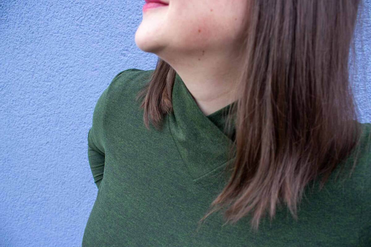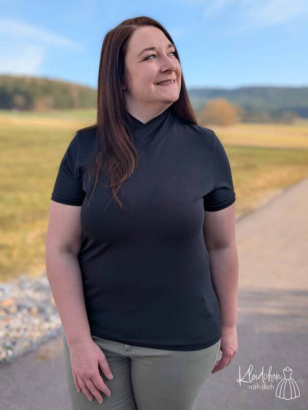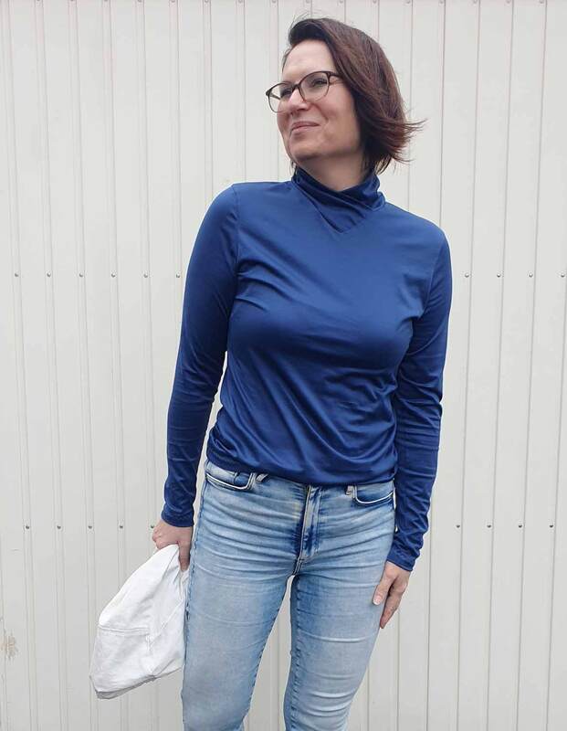 Dieser Schnitt für ein Jersey Shirt mit langen oder kurzen Ärmeln und einem überlappendem Rollkragen/Kelchkragen, der in einen V-Ausschnitt eingesetzt wird, trägt den schönen Namen "Im Blütenkelch verborgen".