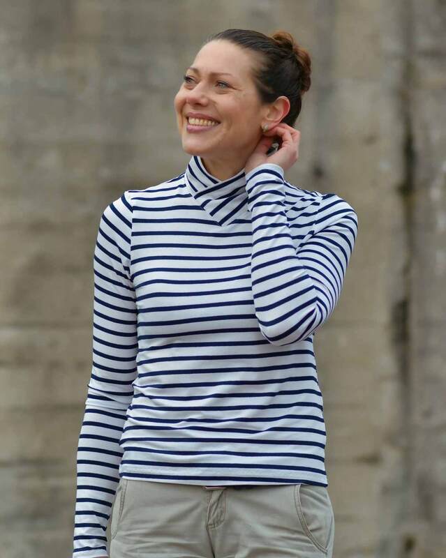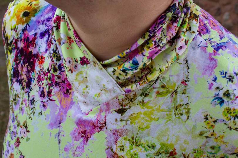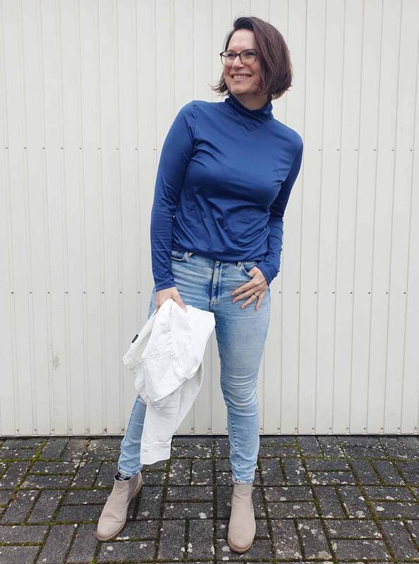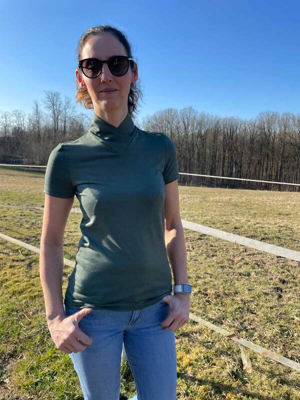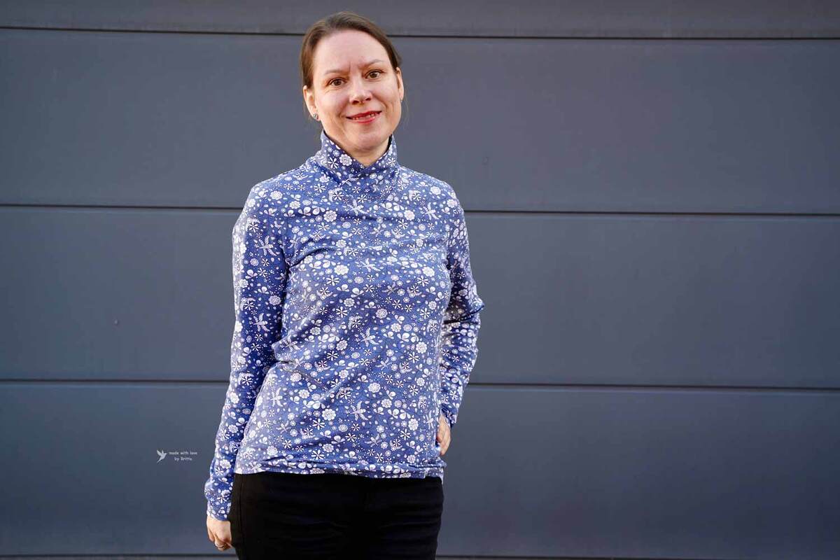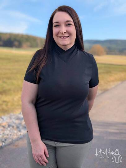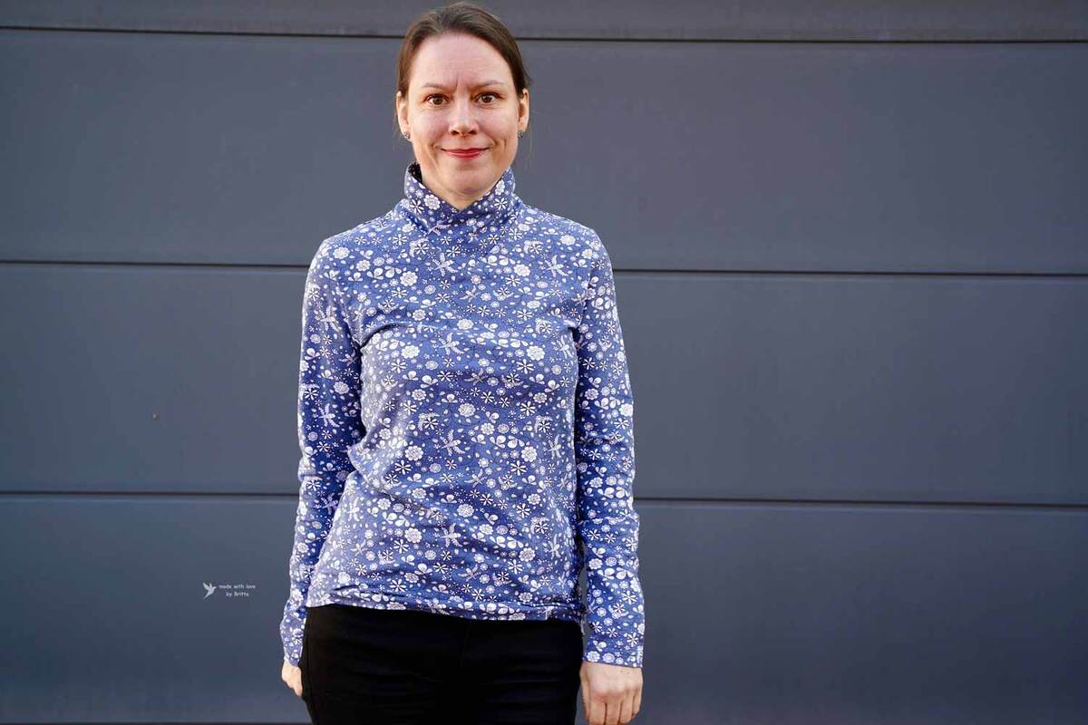 Dieser Schnitt für ein Jersey Shirt mit langen oder kurzen Ärmeln und einem überlappendem Rollkragen/Kelchkragen, der in einen V-Ausschnitt eingesetzt wird, trägt den schönen Namen "Im Blütenkelch verborgen".