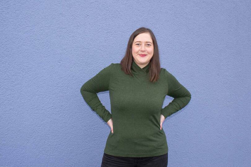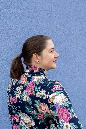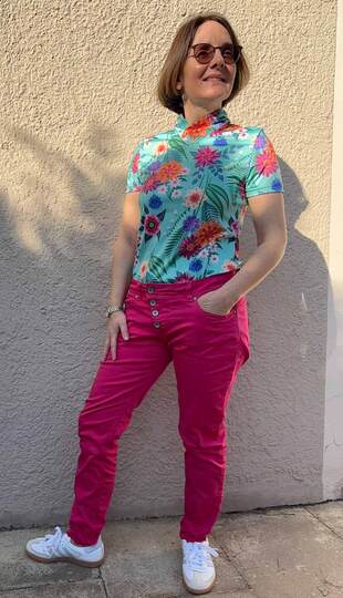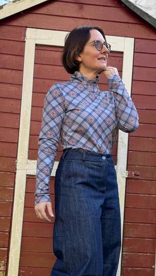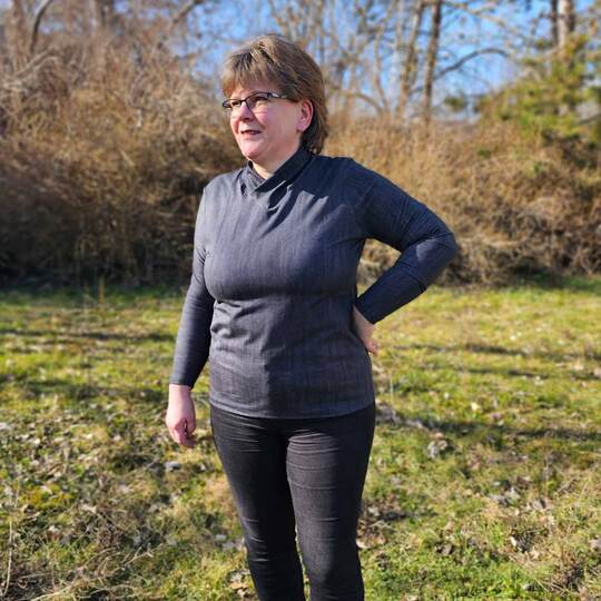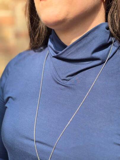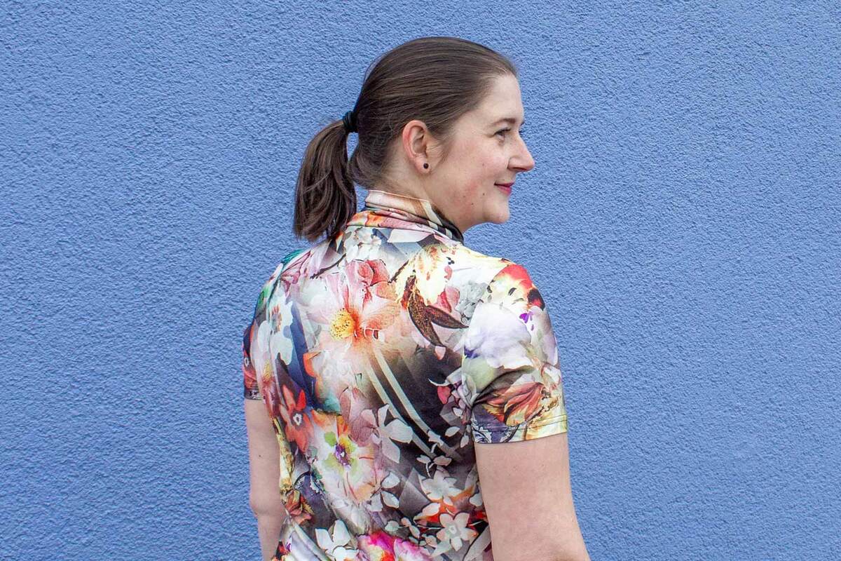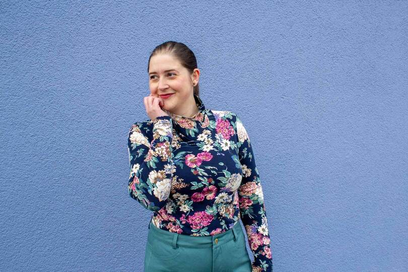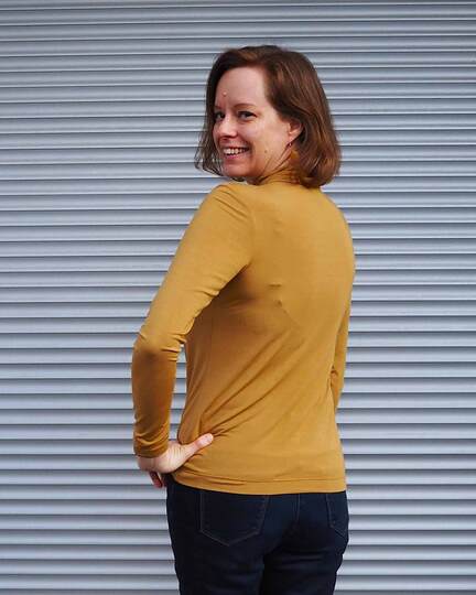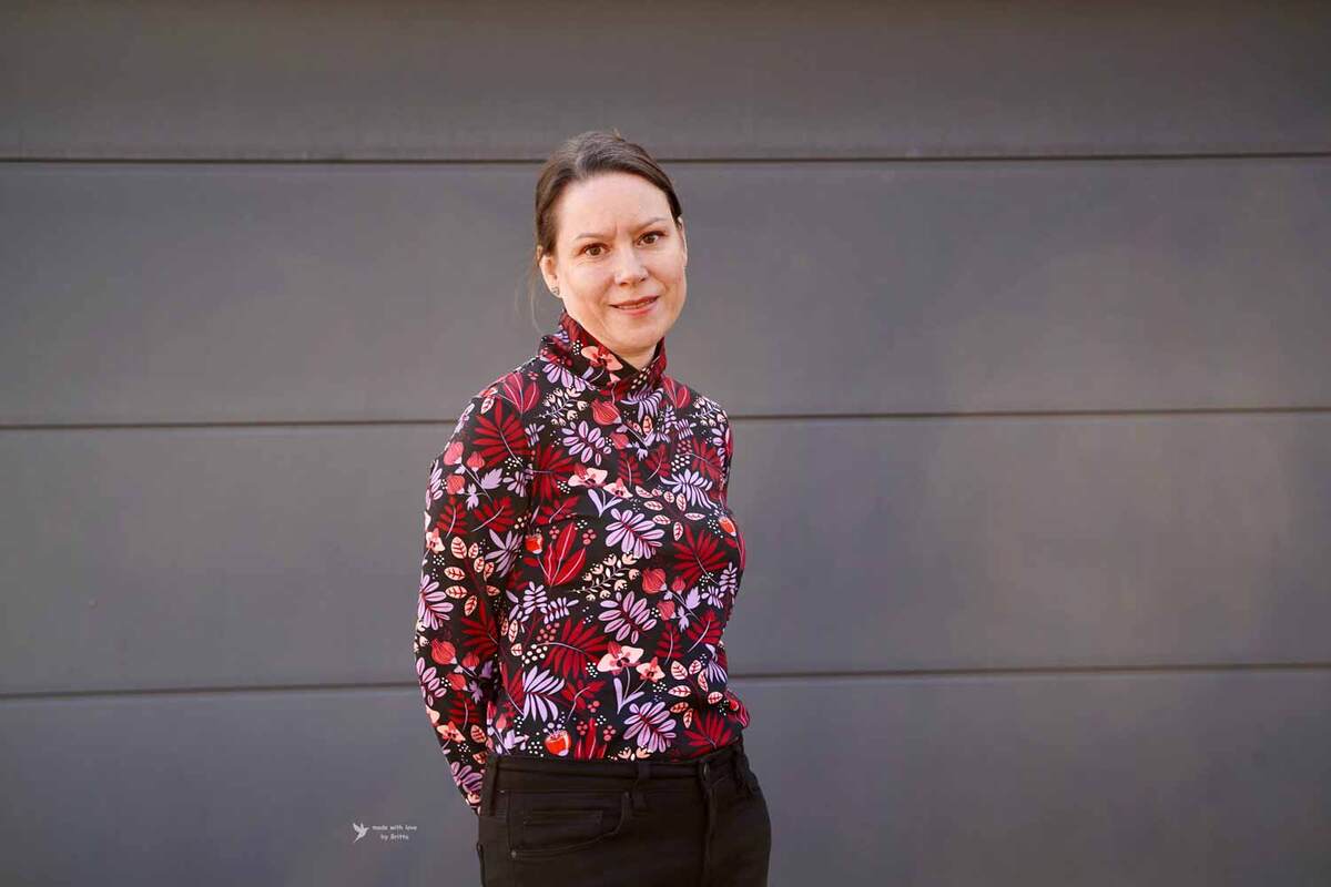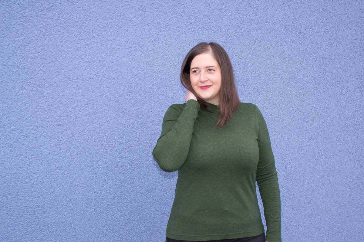 Dieser Schnitt für ein Jersey Shirt mit langen oder kurzen Ärmeln und einem überlappendem Rollkragen/Kelchkragen, der in einen V-Ausschnitt eingesetzt wird, trägt den schönen Namen "Im Blütenkelch verborgen".