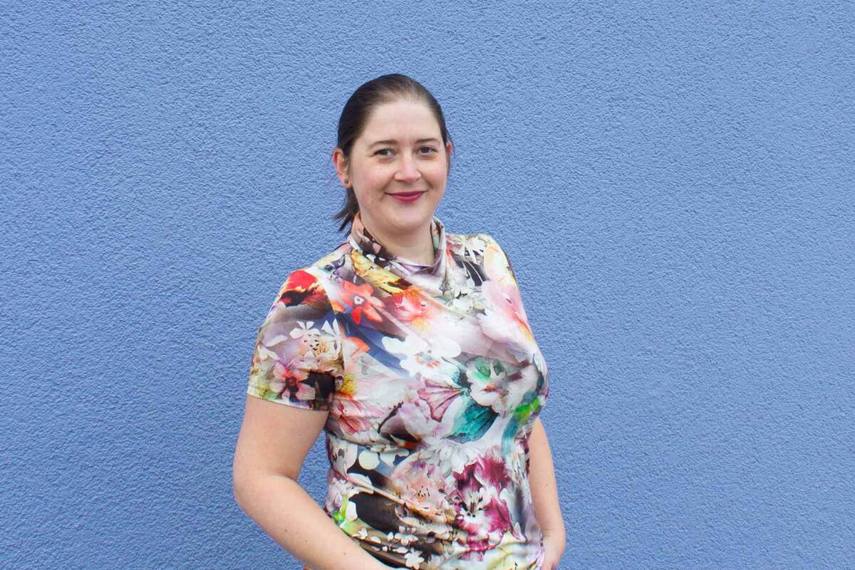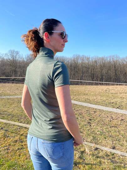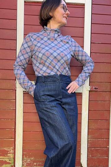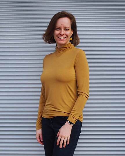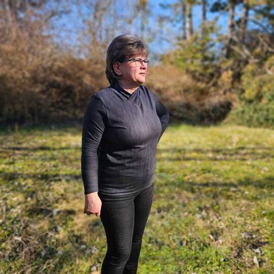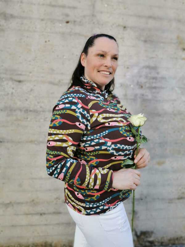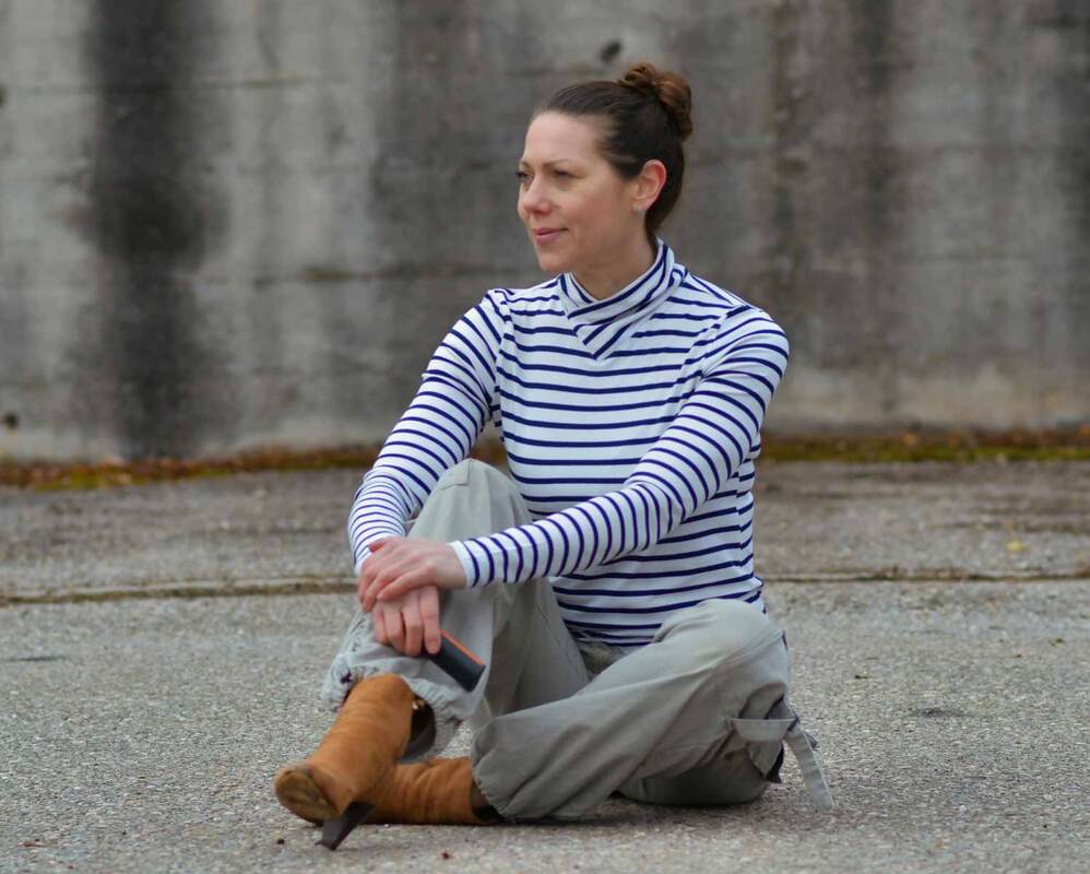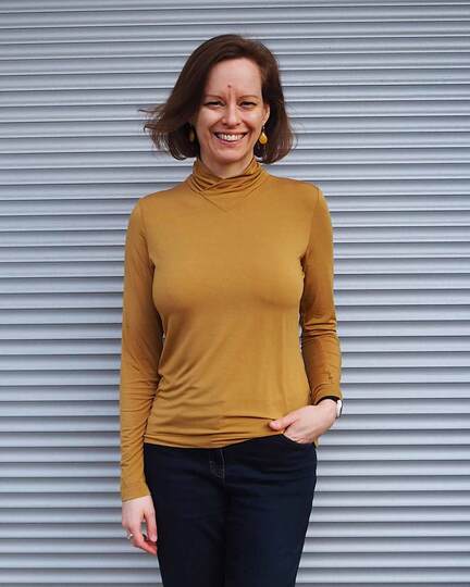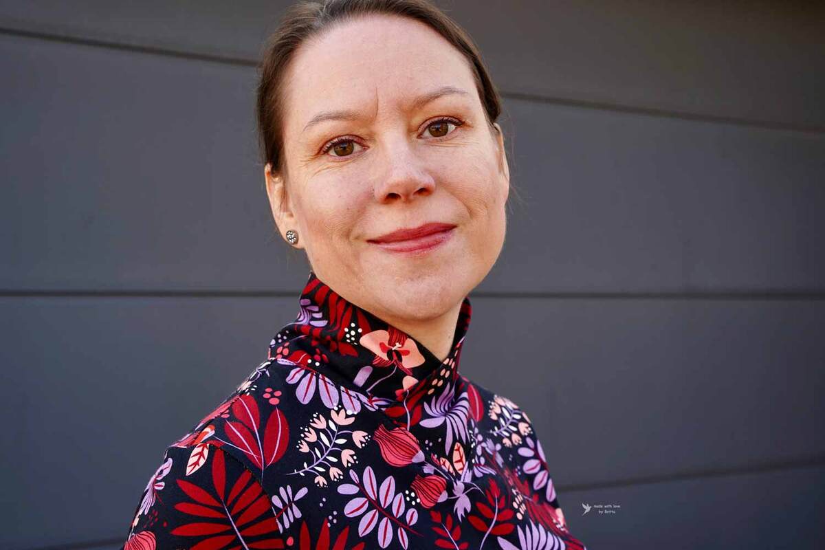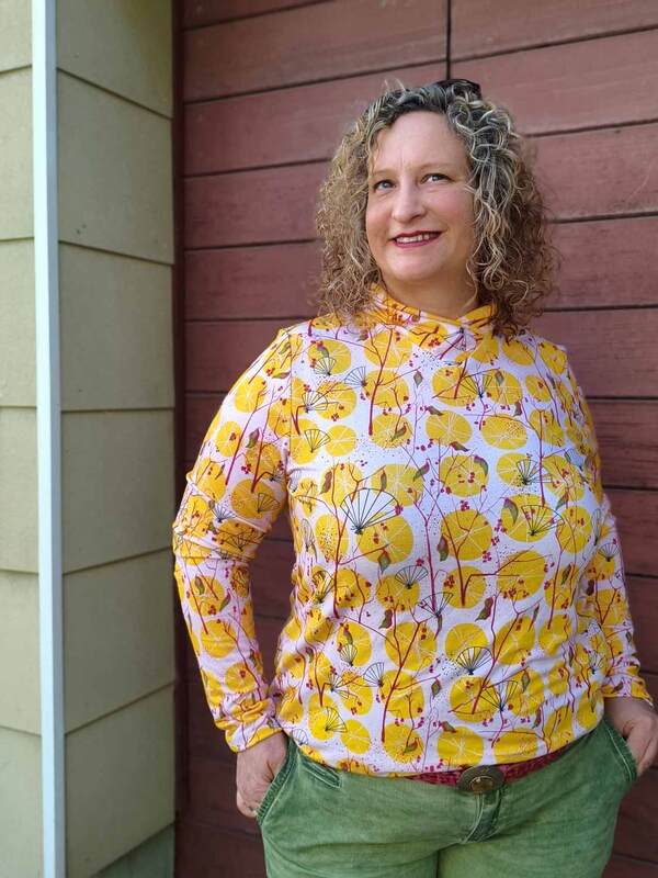 Dieser Schnitt für ein Jersey Shirt mit langen oder kurzen Ärmeln und einem überlappendem Rollkragen/Kelchkragen, der in einen V-Ausschnitt eingesetzt wird, trägt den schönen Namen "Im Blütenkelch verborgen".