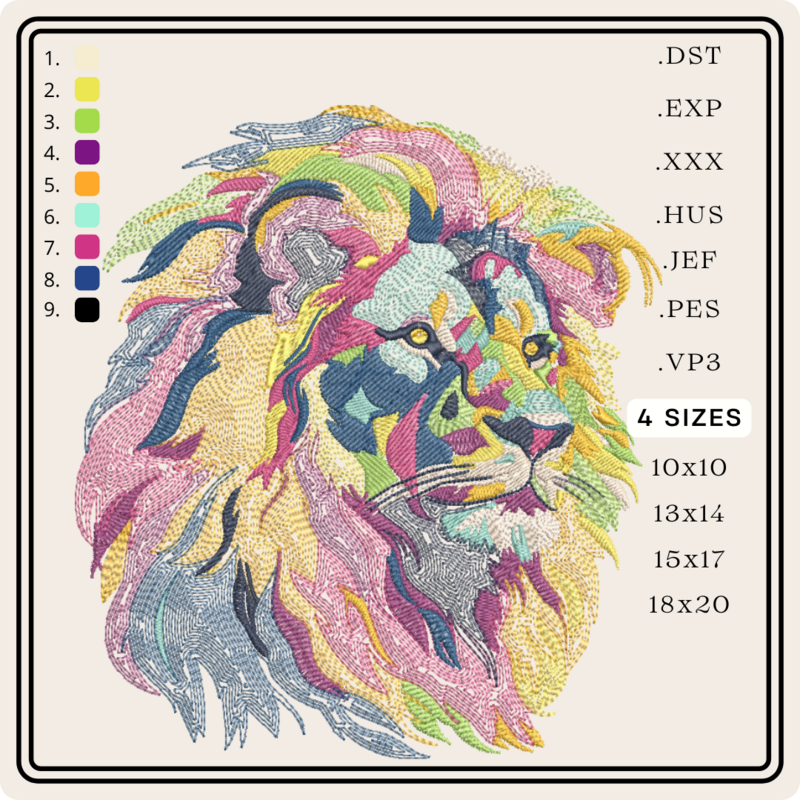 Ein bunter Löwe als Stickdatei, welche ein Aquarellstil andeutet ist sehr besonders und veredelt alle deine Stücke mit einem besonderen Motiv und macht es zu einem wirklichen Highlight. Perfekt kommen die Stickdateien auf Taschen, Kissen oder Kleidung zur Geltung. Da die Datei euch durchgehend ist eigentlich sie sich auch perfekt für Patches.