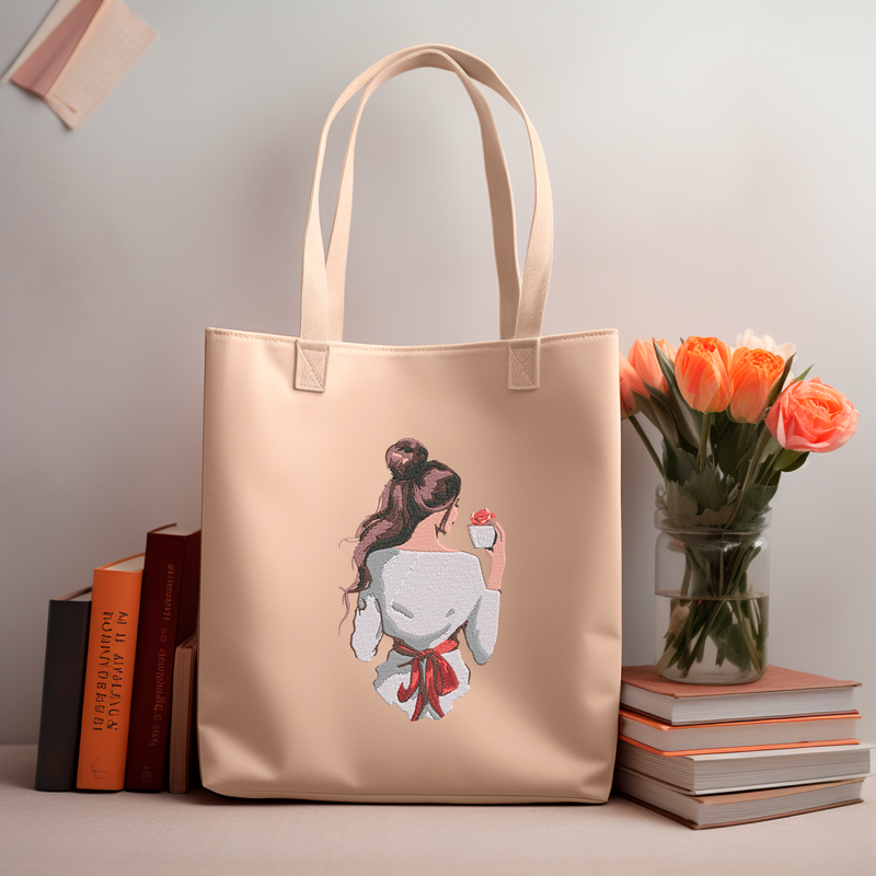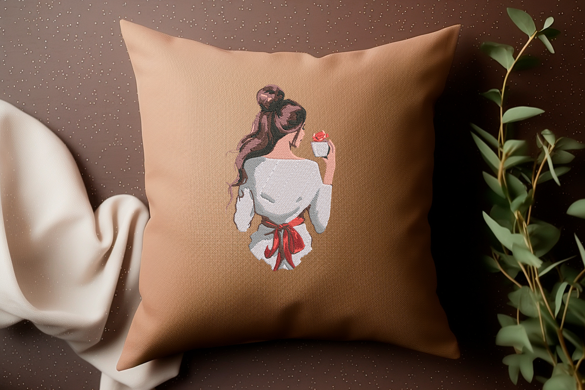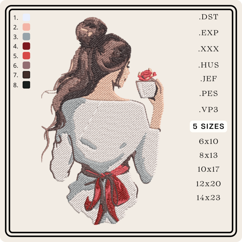 Ein Mädchen, elegant gekleidet mit einer Schleife am Rücken und mit Kaffe in der Hand versprüht Gemütlichkeit und Romantik. Die Stickdatei veredelt alle deine Stücke mit einem besonderen Motiv und macht es zu einem wirklichen Highlight.