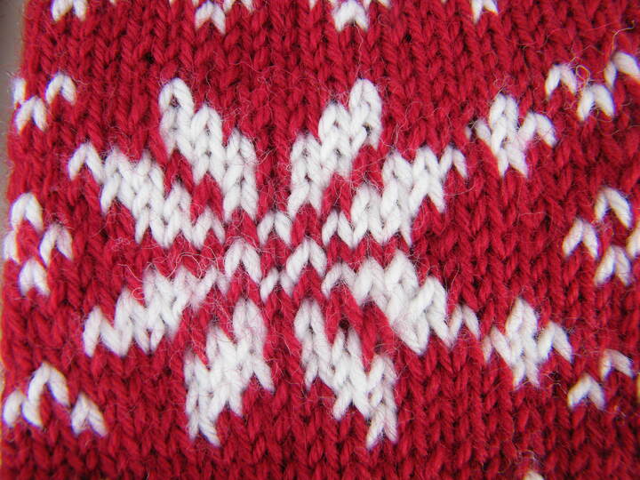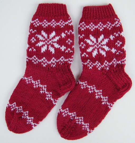 Da die finnische Wolle (7 veljestä von Novita) in Deutschland nicht erhältlich ist, hier Vorschläge für entsprechende Garne. 150g der Wolle 7 veljestä entsprechen 300 m. Für die Socken habe ich ca. 120 g in weinrot und 50 g in weiß benötigt.