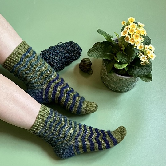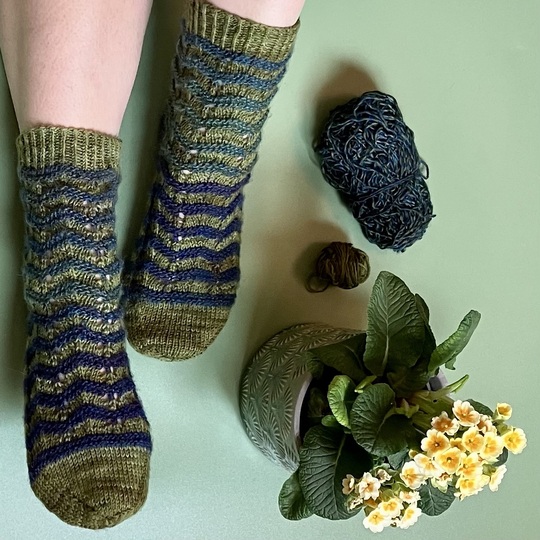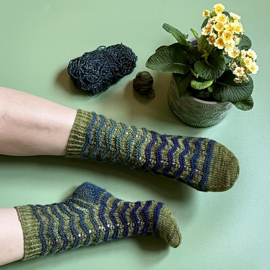 Wellenreiter sind relativ anfängerInnenfreundliche Socken mit plastisch hervorgehobenem Zick-Zack Muster über einem Lochmuster.