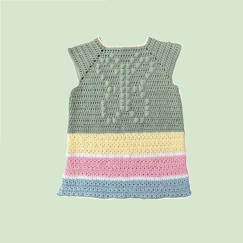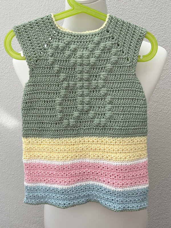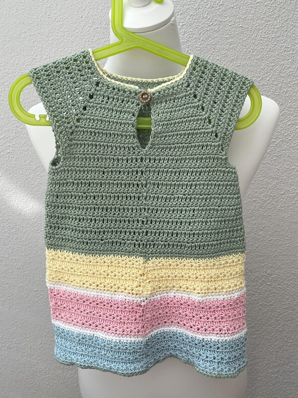 Süßes, sommerliches Kleidchen mit Schmetterling und Blümchen mit Raglanärmelchen, das vom Halsausschnitt (also von oben) gearbeitet wird. Die Anleitung ist für ca. Größe 86 und lässt sich leicht für andere Größen anpassen. Bitte lies die gesamte Anleitung einmal durch, bevor du mit der Häkelarbeit beginnst.