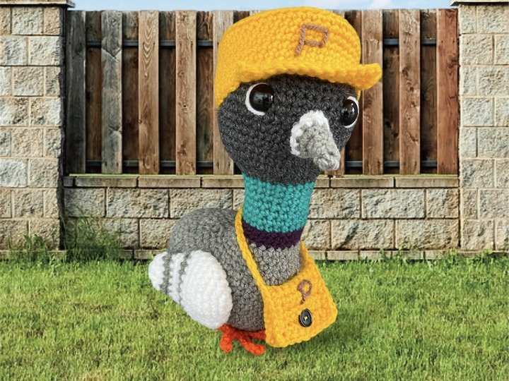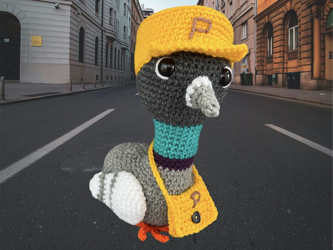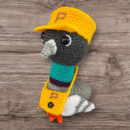 Mit dieser Häkelanleitung kannst du dir eine lustige Brieftaube mit Hut und Tasche häkeln.