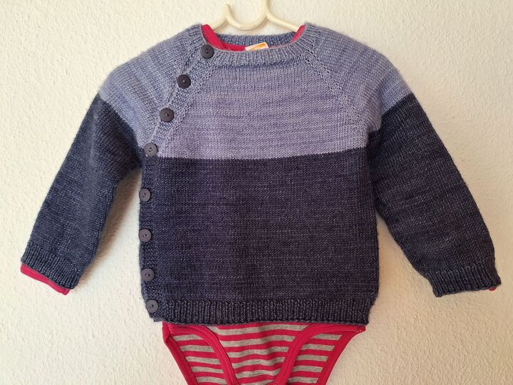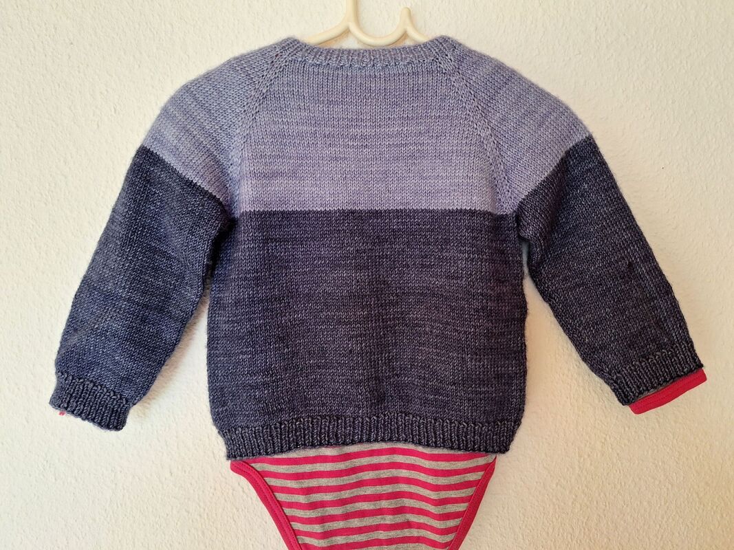 Die im Titelbild gezeigte Version mit den 2 Farbenblöcken können Sie nachstricken ebenso wie ein Streifenmuster, das in einem der weiteren Fotos zu sehen ist.