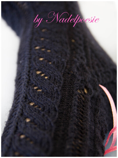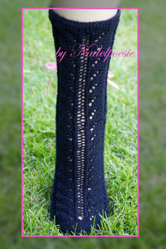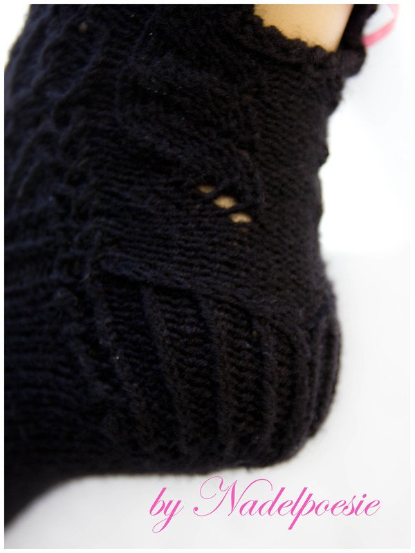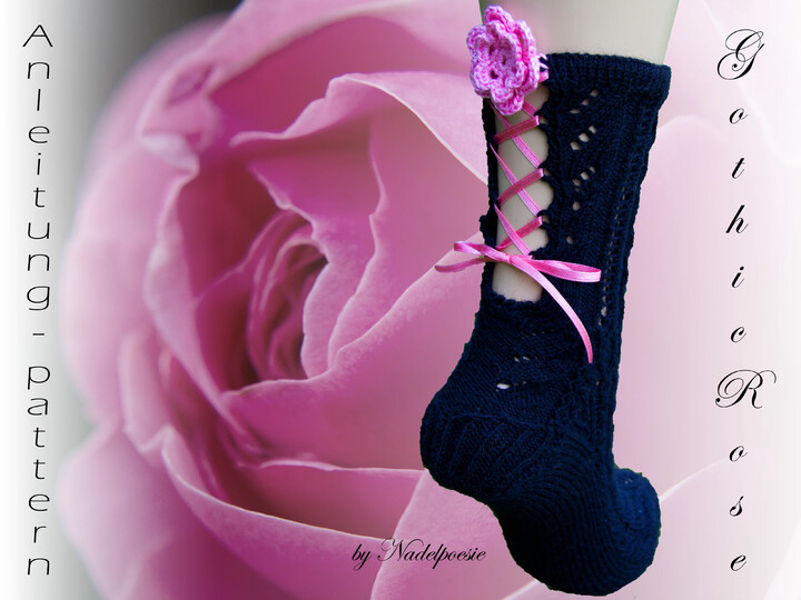Inspiriert von der Gothic-Szene entstand der Entwurf für diese aussergewöhnlichen Socken. In einer anderen Farbe gestrickt, sind sie auch eine aufsehenerregende Alternative zu den gewöhnlichen Trachtenstrümpfen und passen auch hervorragend zu Dirndl oder Tracht. Am Ende der Anleitung befinden sich Hinweise für das fertigen der Socken als Overknees.