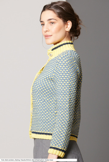 Durch das interessante Hebemaschenmuster in zwei Farben bekommt diese Jacke ihr frisches Aussehen und kann sowohl zu sportlichen Hosen als auch zum bürotauglichen Rock getragen werden. Wobei die Bündchen und der Stehkragen unifarben mit einem kontrastfarbigen schmalen Steifen im 2/2-Rippenmuster gestrickt sind. Das Modell wird mit praktischen Druckknöpfen an der Rippenblende geschlossen. Wir empfehlen ein pflegeleichtes Garn aus Baumwolle und Polyamid. Eine Anleitung kann für die Größen 36/38, 40/42 und 44/46 downgeloadet werden.