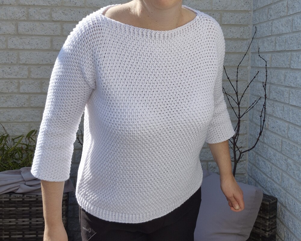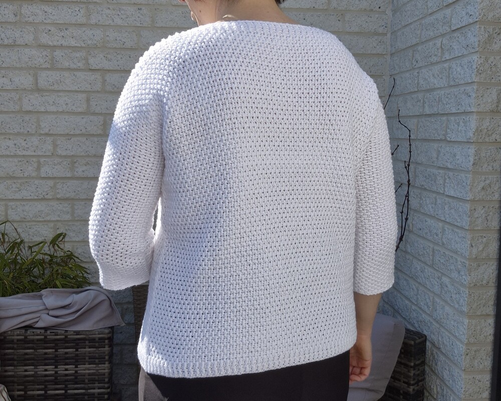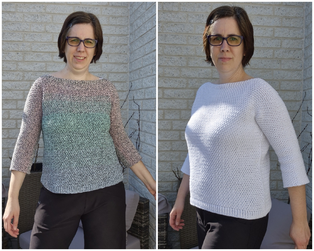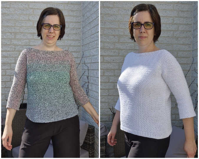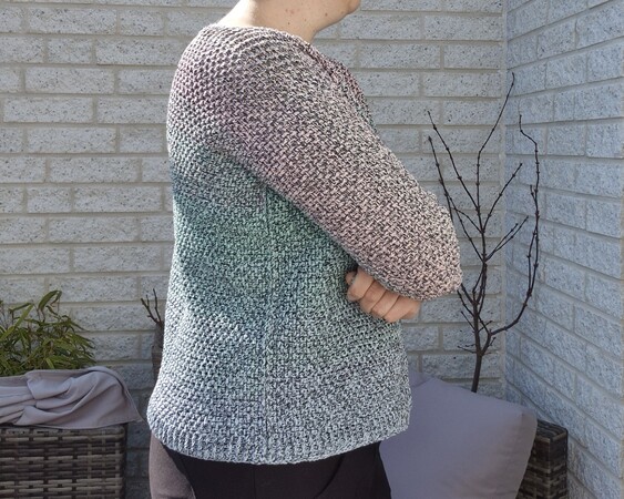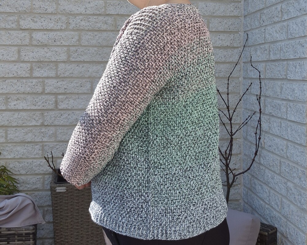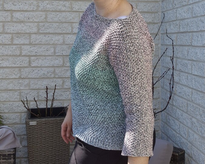 Der Pulli wird von unten nach oben und über die Schultern wieder nach unten gehäkelt.