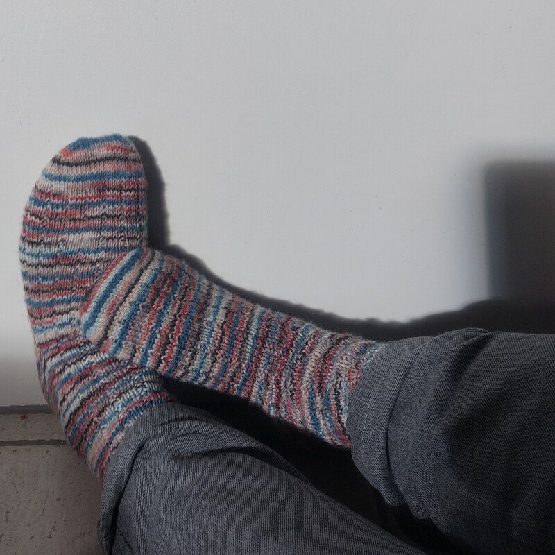 PARI socks - Das wunderschöne Garn für die Socken war ein Mitbringsel aus PARIs, zufällig auch noch in den Farben der französischen Flagge. Sie sind im einfachen 1x3-BRP-Muster (engl. "broken rib pattern" - durchbrochenes Rippenmuster) gestrickt - die perfekte Leinwand für besondere, z. B. handgefärbte Sockengarne. Das elastische Rippenmuster sorgt für einen guten Sitz und eine bequeme Passform. Die Socken werden am Bündchen begonnen und die Zunahmeferse passt hervorragend zu gemusterten Garnen, da keine ungewollte Unterbrechung des Musters an der Ferse erzeugt wird. Außerdem ergibt die Zunahmeferse viel Weite und eignet sich deshalb gut für Füße mit einem hohen Spann. Abgeschlossen werden die Socken mit einer klassischen, runden Bandspitze.