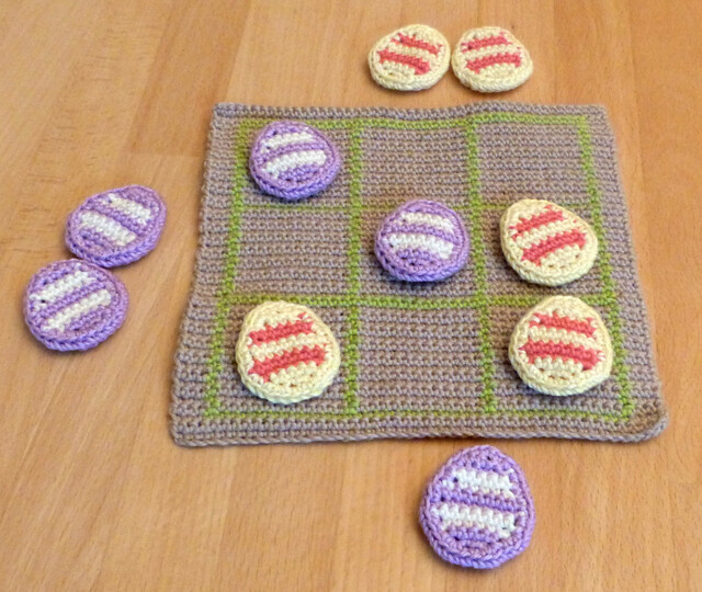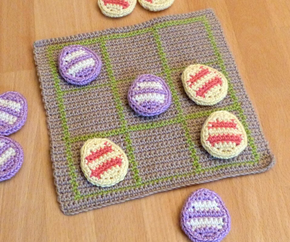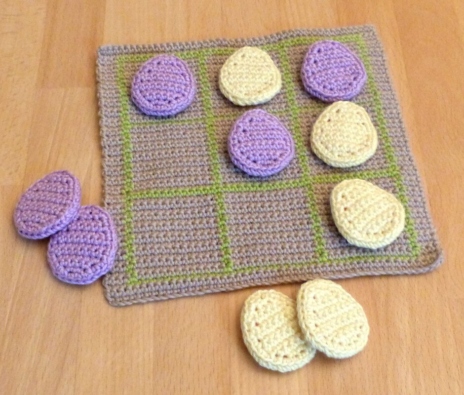 Bei Verwendung von Baumwollgarn mit einer Lauflänge von ca. 125m/50g und Nadelstärke 3 wird das Spielfeld etwa 21 x 21 cm groß und die Eier werden 4 x 5 cm groß.