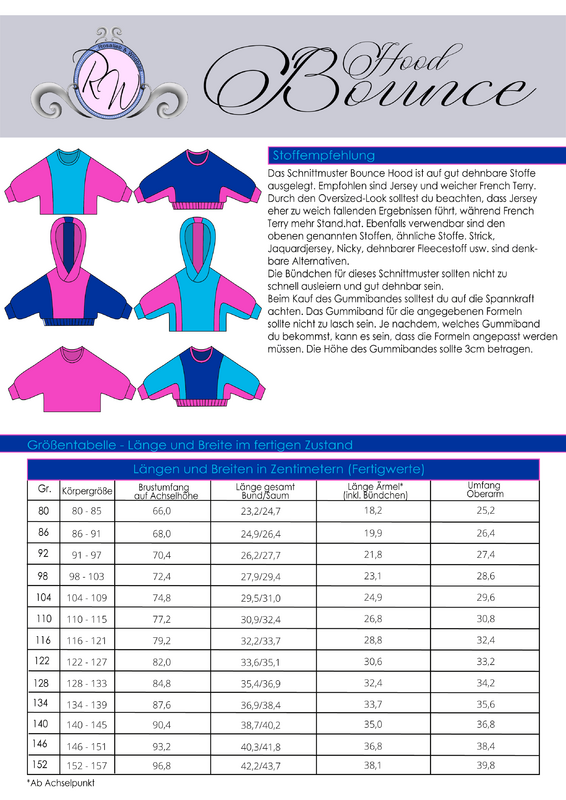 Das Schnittmuster ist in Echtgröße (du nähst hier nach echter Körpergröße) gradiert und enthält keine Naht- und Saumzugabe. Es umfasst die Größen 80 bis 152 und ist damit für eine Körpergröße zwischen 80 und 157cm geeignet. In den Dateien findest du die A4-Versionen zum Ausdrucken, eine A0-Datei sowie die Beamerdatei - alle Versionen inkl. Ebenen zum Ein- und Ausblenden der Größen. Bounce Hood ist auf French Terry, Jersey, Jaquardjersey dehnbaren Fleece und ähnliche Stoffe ausgelegt.