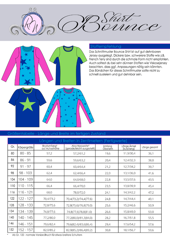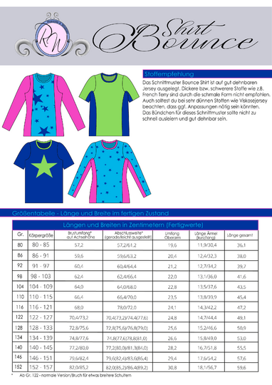 Das Schnittmuster ist in Echtgröße (du nähst hier nach echter Körpergröße) gradiert und enthält keine Naht- und Saumzugabe. Es umfasst die Größen 80 bis 152 und ist damit für eine Körpergröße zwischen 80 und 157cm geeignet. In den Dateien findest du die A4-Versionen zum Ausdrucken, eine A0-Datei sowie die Beamerdatei - alle Versionen inkl. Ebenen zum Ein- und Ausblenden der Größen. Bounce shirt ist auf Jersey ausgelegt.