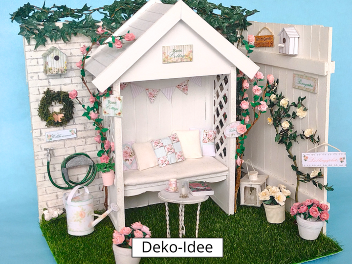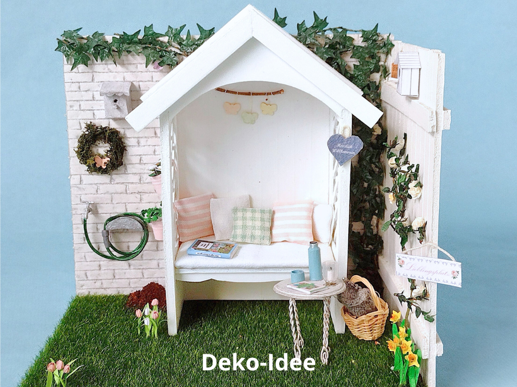 kannst du dir eine Miniatur-Laubenbank im Maßstab 1:12 basteln.