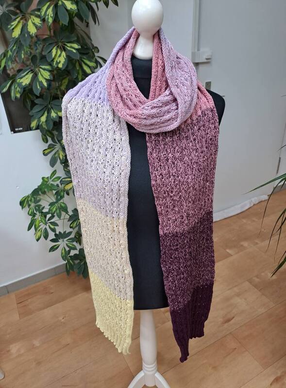 Du kannst einen normalen Schal, eine wunderschöne zarte Stola, einen Schlaufenschal, ein Loop oder einen Ärmelschal daraus fertigen.