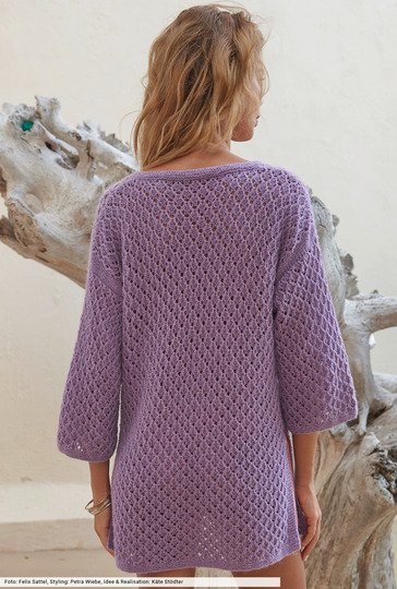 Hüftlang, mit Seitenschlitzen und Vorderteil-Schnürung – so zeigt sich dielässige Tunika von ihrer modischen Seite. Die transparenten Netzstrukturen sorgen für Durchzug und werden mit Hilfe einer kleinen Strickschrift gearbeitet. In zartem Flieder ein toller Begleitet, der, wenn es am Strand plötzlich kühl wird, schnell und easy über den Bikini gezogen werden kann.