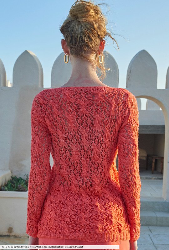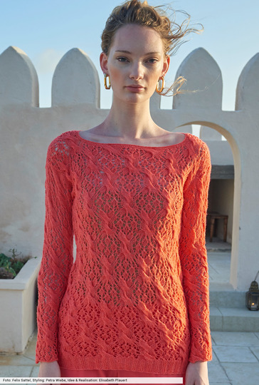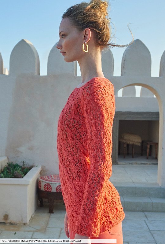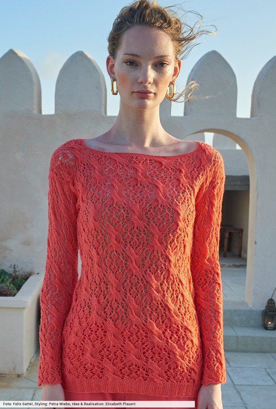 Das megaweiche Garn aus Baumwolle und einem kleinen Schurwoll-Anteil lässt das markante Ajour-Zopfmuster toll zur Geltung kommen und trägt sich wunderbar angenehm auf der Haut. Der aparte Pulli präsentiert sich in dynamischem Korallerot – die Trendfarbe in diesem Sommer. Ganz klassisch in vier Teilen, mit einer elastischen Rippenblende am Saum und einer schmalen Glatt-rechts-Kante für den Halsausschnitt.