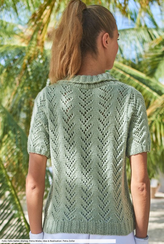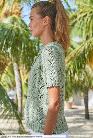 Hier reihen sich Ajourstreifen auf Glatt-rechts-Fond und lassen ein weich fallendes Sommershirt mit kurzen Ärmeln entstehen. Der lockere Sitz kommt aber nicht nur durch das Muster, für das du in der Anleitung eine Strickschrift findest, sondern auch durch das Garn, bei dem leicht aufgeraute, sehr softe Baumwolle ins Nadelspiel kommt. Zum Schluss stattest du den Pulli noch mit einem Rippenkragen aus und vervollständigst die Vorderteilblenden mit Knöpfen.