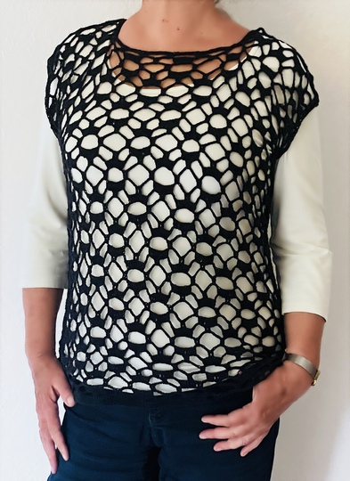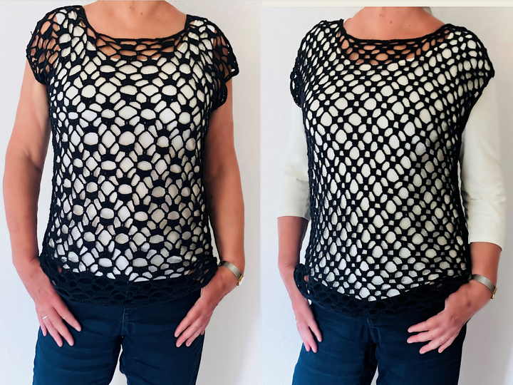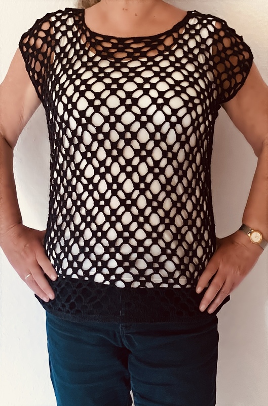 Dieses Netzshirt habe ich mir so gedacht: Du suchst dir ein weißes Shirt von dir aus, das dir vielleicht etwas zu eng geworden ist, aber du möchtest es nicht wegschmeißen - oder - vielleicht hat eines deiner Lieblingsshirts einen Fleck, den du nicht mehr rausbekommst. Dann häkelst du dir dieses Netzshirt, ziehst es über das weiße Shirt und schon ist jeder Makel behoben. Ich gebe dir hier 2 Muster zur Auswahl. Vielleicht möchtest du auch 2 Shirts häkeln?