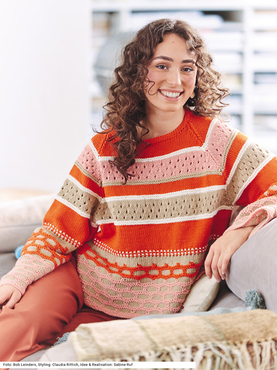 Langeweile kann beim Stricken dieses Raglanpullis nicht aufkommen. Fünferlei Muster – kraus rechts und glatt rechts, Wabenmuster, Hebemaschenmuster und Lochmuster – dazu vier Farben garantieren dafür. Die hohen Seitenschlitzen sind begrenzt mit kraus rechts; im selben Muster wird auch die schmale Bundblende und die Blende am Halsauschnitt gearbeitet. Weite Ärmel und ein legerer Schnitt sorgen für Bequemlichkeit. Mit einem weichen Wohlfühlgarn aus Baumwolle und Polyacryl steht eine Anleitung in den Größen 38/40, 42/44 und 46/48 zur Verfügung.
