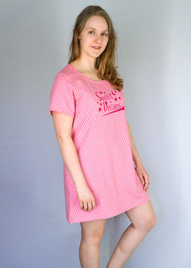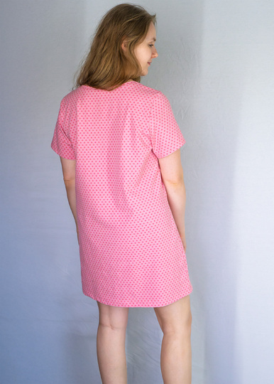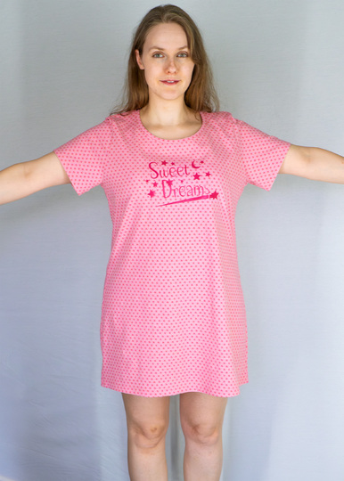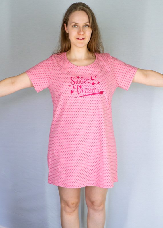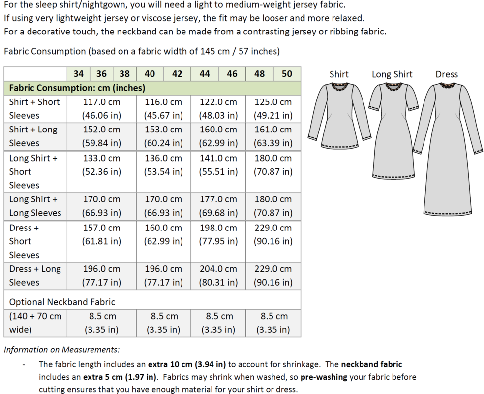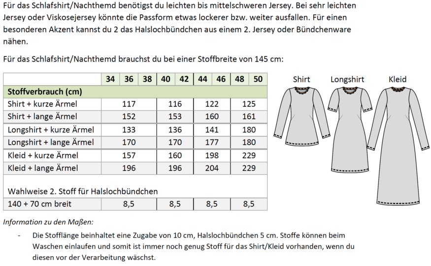 Mit dem Schnittmuster „Nachthemd & Shirt“ kannst du ein bequemes Jerseyoberteil in drei Längen nähen – als Shirt, Longshirt (knieumspielend) oder wadenlanges Nachthemd. Das Modell ist vielseitig tragbar – ob als Nachtwäsche oder als luftiges Freizeitshirt.